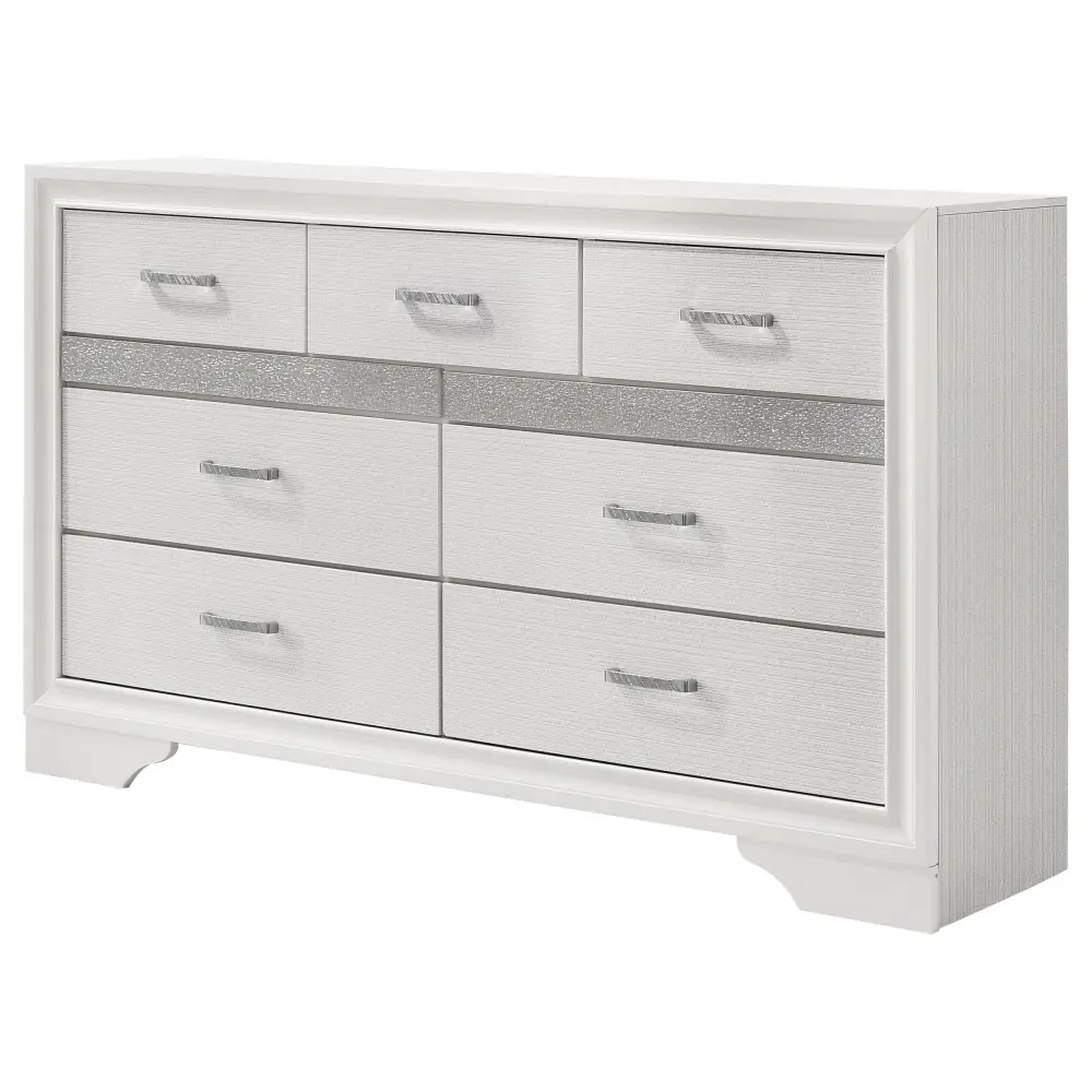 Infuse your space with sophisticated grace. The chic design of this beautiful dresser lends a touch of elegance to any bedroom. Felt-lined drawers keep delicate belongings safe and secure. A hidden jewelry drawer provides a discreet place to store your valuables. Complete with a glittery panel across the front, this piece exudes sparkling opulence.