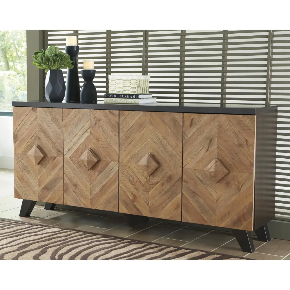 Diamond life. Make a bold, brilliant statement with this 4-door accent cabinet. Its two-tone styling merges a dark brown exterior with a multi-tonal distressed finish on the doors and processes. A diamond-shaped plank effect brings rich, dimensional flair to the scene. Adjustable shelving makes this high-end accent piece highly functional.