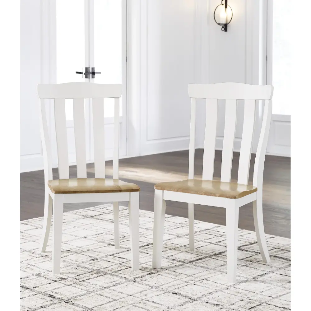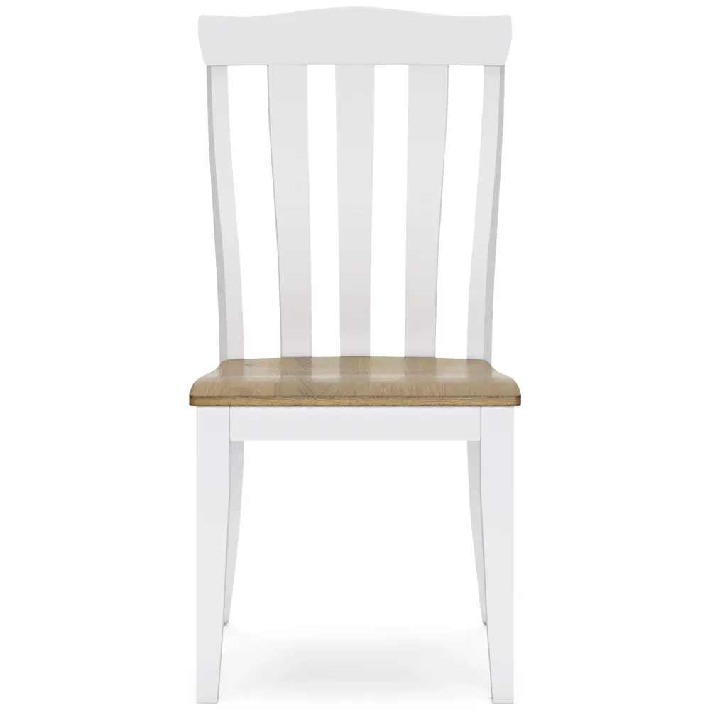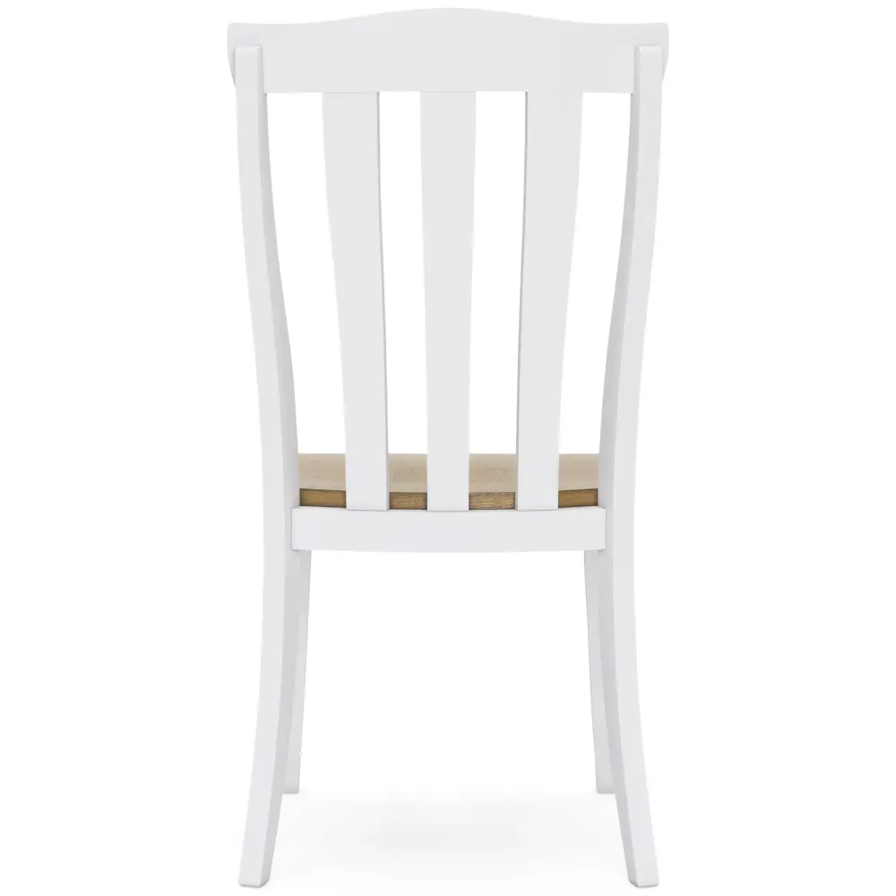 Casual style with substance. This dining side chair’s two-tone finish of classic white and butcher block oak veneer adds a relaxed vibe to a delicious design. The curved shape of its bent slat-back frame offers a sense of present-day farmhouse style, while the contoured seat adds comfort. Sit back and dine in charmingly fine fashion in your informal dining room or eat-in kitchen.