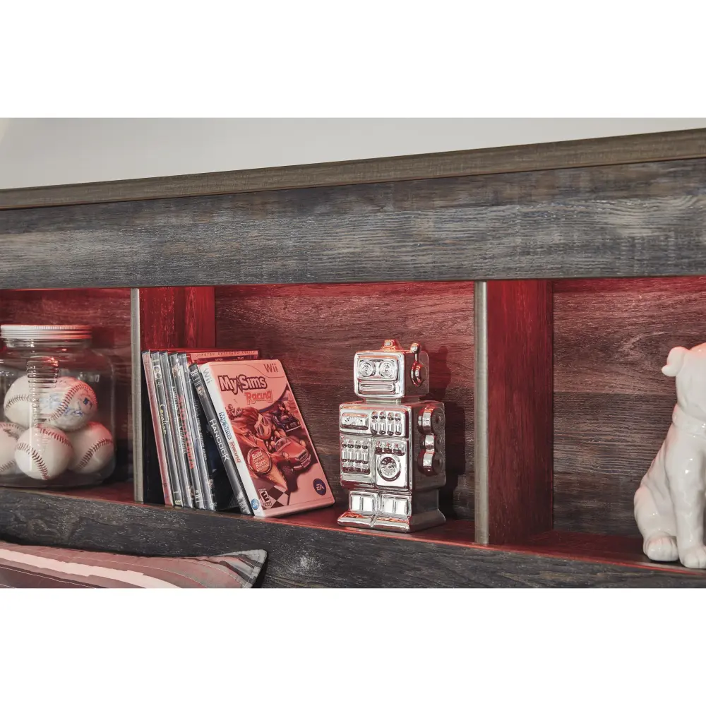 When merged in just the right way, rustic and industrial styles can make one happy marriage. Case in point: this full bookcase headboard. A refined take on barn board beauty, its complex, replicated wood grain showcases hints of burnt orange and teal tones for a sense of weatherworn authenticity. Three open cubbies lined with a dimming LED light strip preserve bedtime reads top of mind.