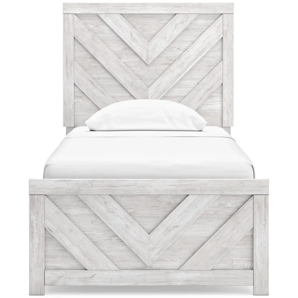 Charmingly designed, this twin panel bed embraces the aesthetics of countryside living and repurposes them for modern settings. Its whitewash paint, replicating the wear and tear of time, appeals to your love of timeless character. And a chic chevron pattern on the headboard and footboard keeps your bedroom effortlessly on trend.