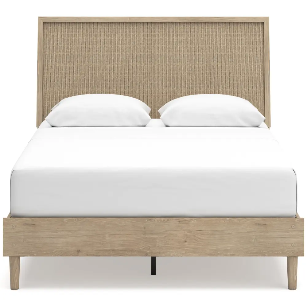 Clean-lined and contemporary—but far from stark—this queen panel bed is a fresh style awakening. Pairing a light finish with replicated oak grain and textured buff details that replicate the look of cane, its mixed materials bring a naturally versatile vibe to your bedroom. Talk about style with added dimension. Its simplicity plays perfectly with the cutting-edge aesthetic and calming mood you long for in your tranquil retreat.