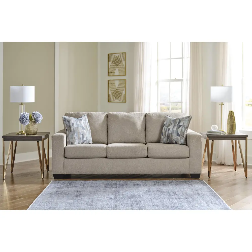 You’re in for a neat treat with this sofa. Its comfy seats are covered in plush, textural upholstery, and the wide track arms are eager to support your quest for total relaxation. Distressed abstract toss pillows bring a fresh breath of contemporary style while accentuating the sofa’s color.