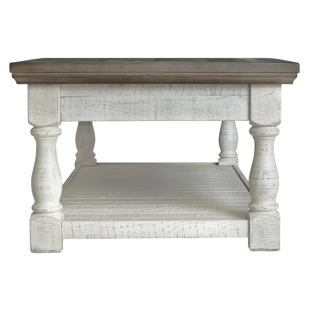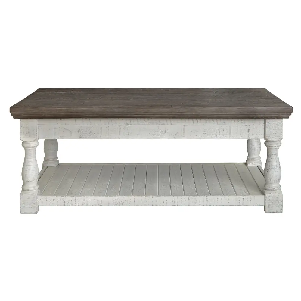 With its richly rustic finish and textural mix, this lift-top coffee table goes to town on bygone beauty. Its distressed two-tone treatment blends a weathered gray with timeless white for an utterly charming effect. The lift-top design adds function to your very comfortable space.