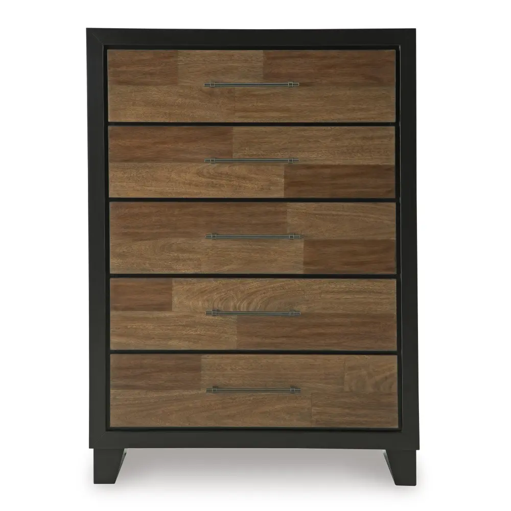 Experience the captivating allure of this chest of drawers, an simple blend of casual and refined aesthetics. Its two-tone finish merges satin black with a rich brown wood tone for a modern, relaxed vibe that you’ll love waking up to. Perfectly suited for your contemporary home, this chest has plenty of drawer space to tuck away your wardrobe and spare bed linens.