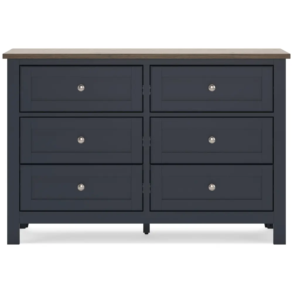 Add homespun charm to your restful retreat. A modern take on a timeless silhouette, this dresser pairs a dark slate blue finish with a light espresso top. Drawer fronts and legs in a classic Shaker style bring an air of beautiful simplicity to the bedroom. Whether it’s part of a charmingly curated guest suite or a casually carefree kids room, this dresser is a welcome addition.
