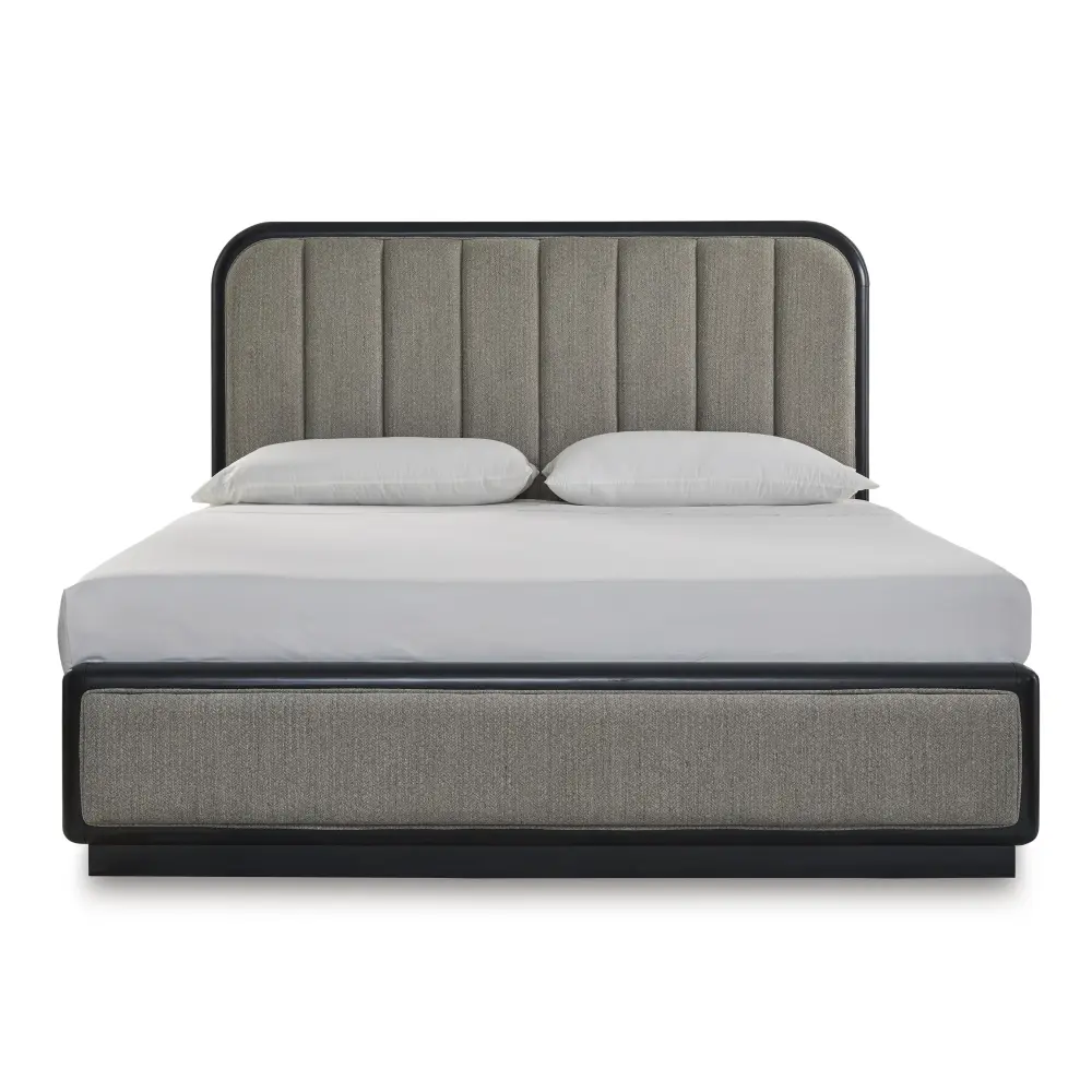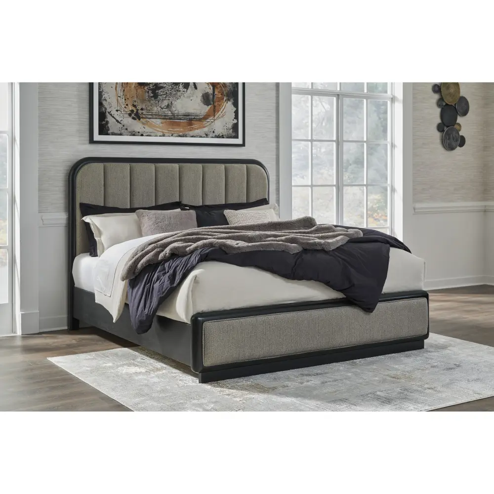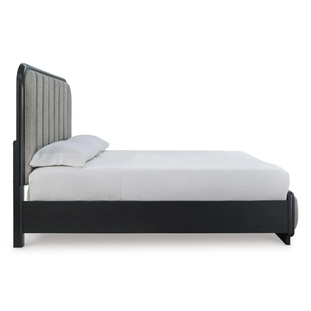 Inspired by art deco design, this softly shaped California king upholstered panel bed makes a lasting impression in a simply stunning way. Its magnificent curved silhouette is enhanced by a rich layered black finish on the textured wood grain surface. The channeled vertical headboard and footboard, wrapped in herringbone patterned-surface upholstery, merge form and function. This is the statement piece you’ve been dreaming of to elevate your contemporary inner sanctum.