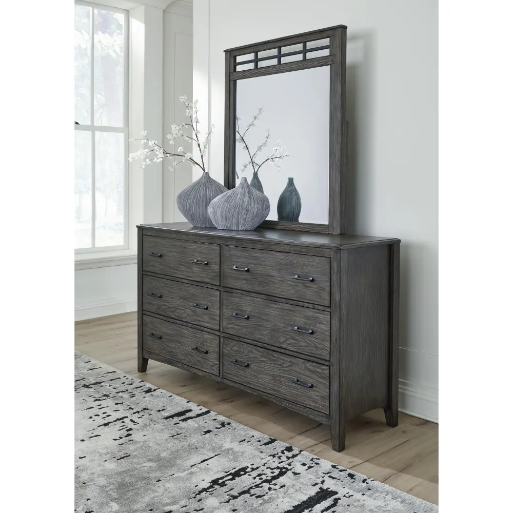 Cool and clean, yet warm and inviting. This dresser with mirror has so many standout qualities, making it an inspired choice for your dream destination. A prime example of “casual contemporary” style at its remarkably best, these designer pieces are dressed to impress with an embossed wood grain texture. Spacious inset drawers with absolutely finished interiors offer ample storage for your wardrobe and spare bed linens. And the medium gray-brown finish with a blackened wood grain is wonderfully easy on the eyes.