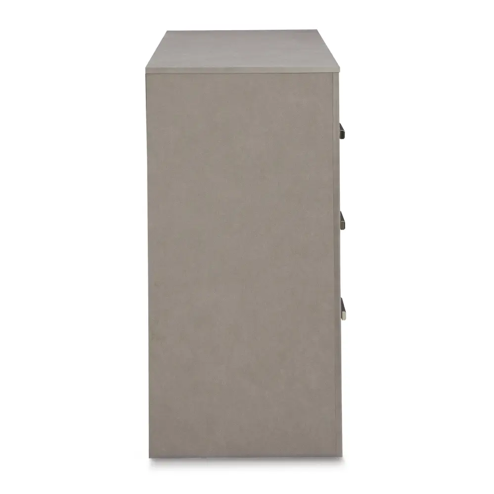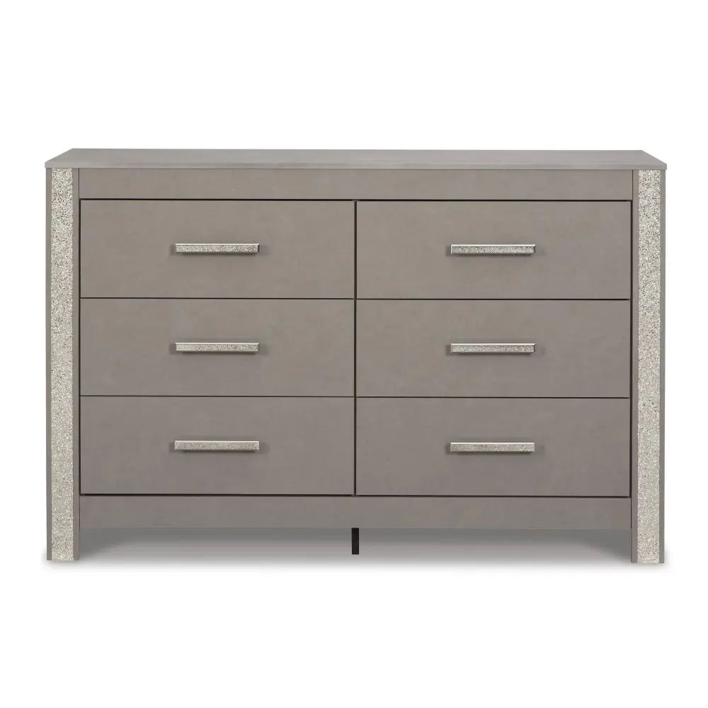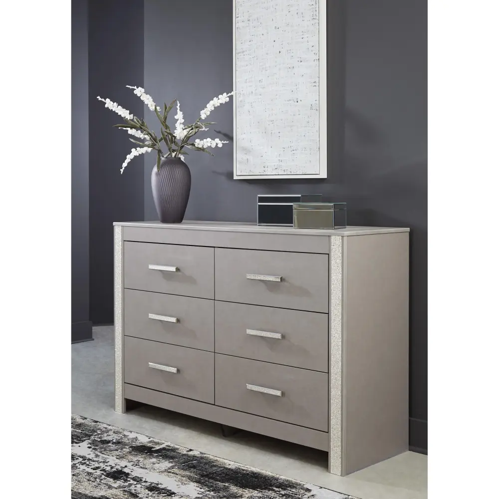 Love sleek and bold contemporary style? Drink in the beauty of this dresser. Its eye-catching details include glam glitter accents and the look of leather grain with a subtle gray finish. Large-scale linear handles, in a sophisticated champagne chrome tone, play perfectly with the streamlined aesthetic. This storage piece is a effortlessly stunning way to achieve the bedroom of your dreams.