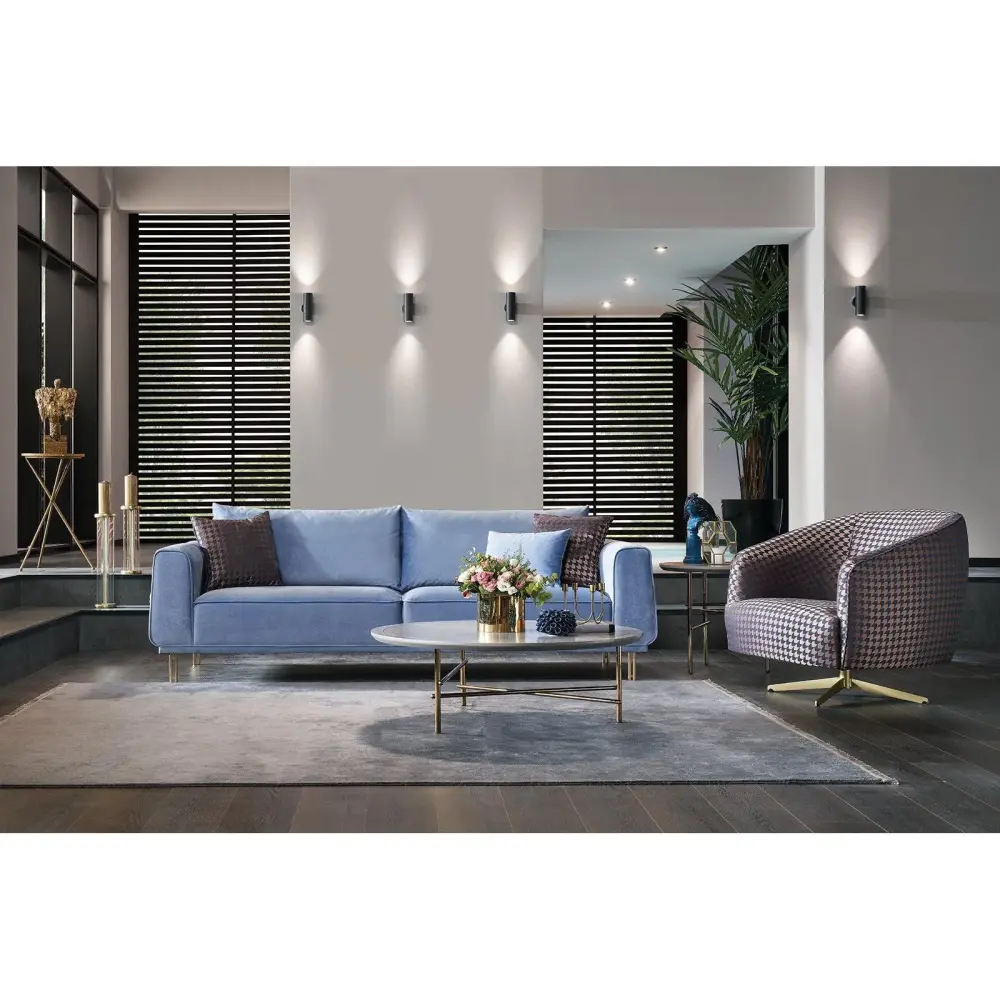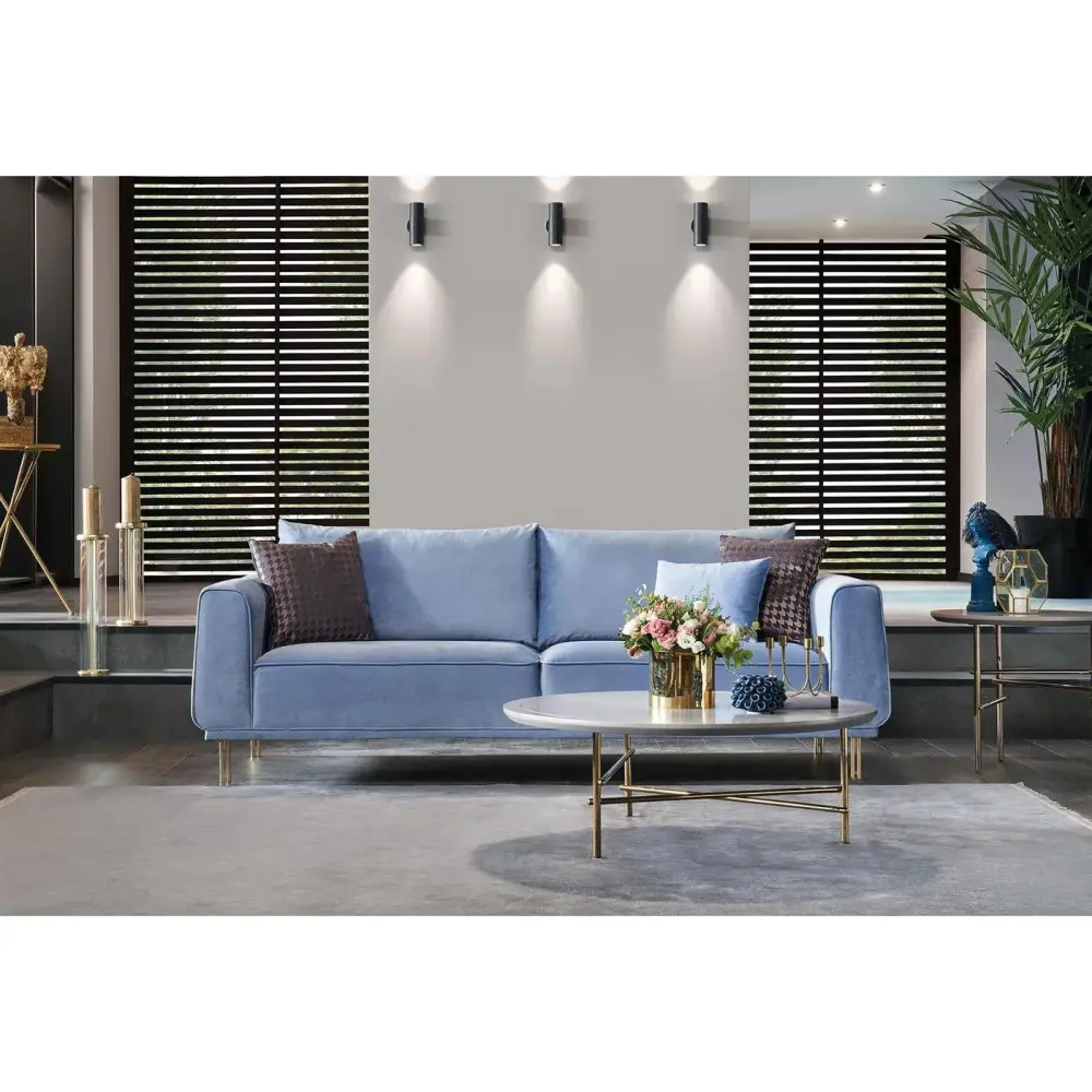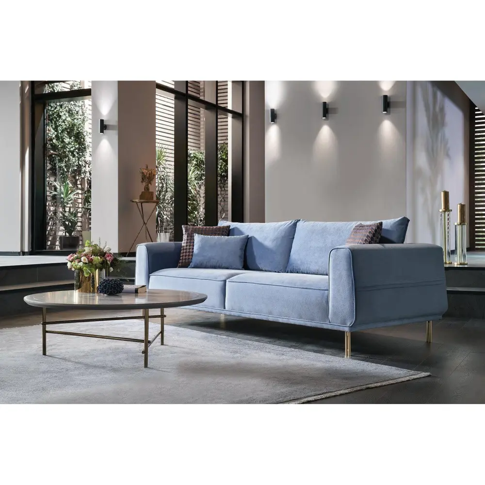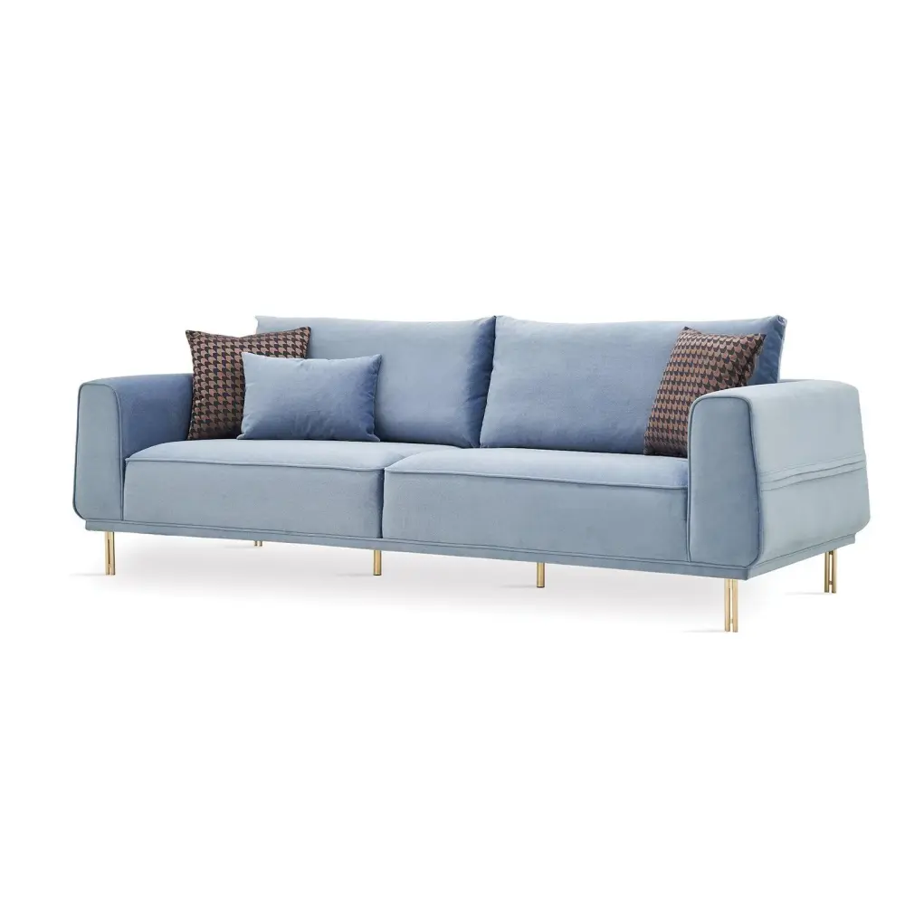 The Merida 3-Seater Sofa from Enza Home will make a superb addition to your living room. It features track arms, gold finished legs and is upholstered in Blue fabric.