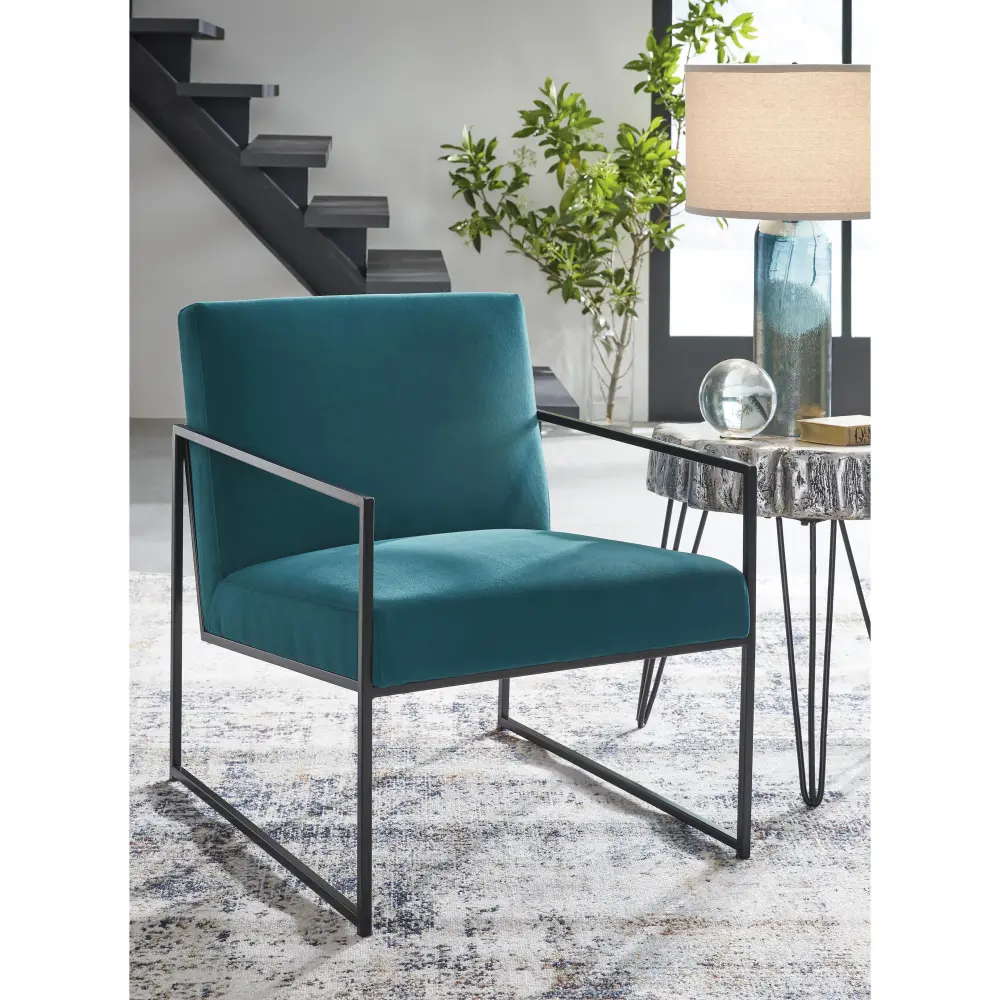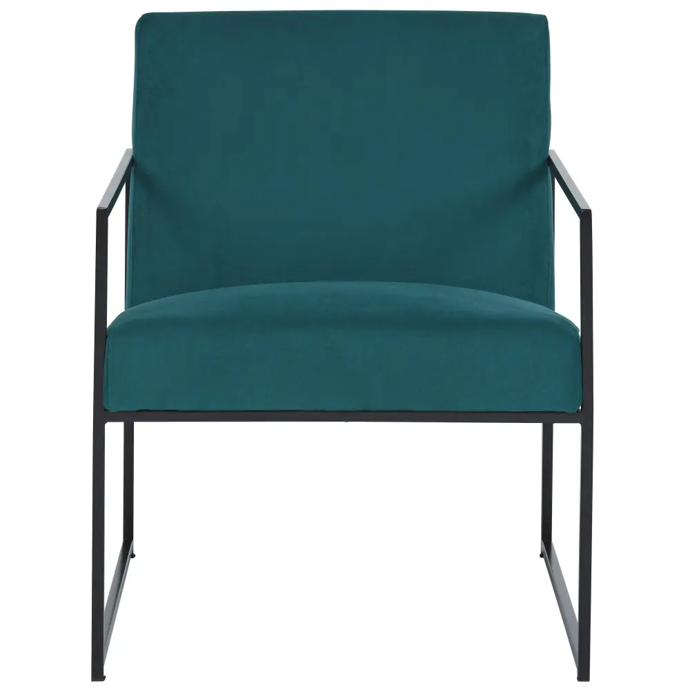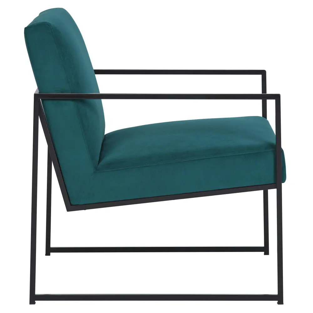 Dress up your reading nook or den with the decidedly contemporary stylings of this accent chair. Velvet fabric in a teal tone provides a pop of yielding color while remaining reserved and refined in appearance. A streamlined metal frame polishes off the posh design.