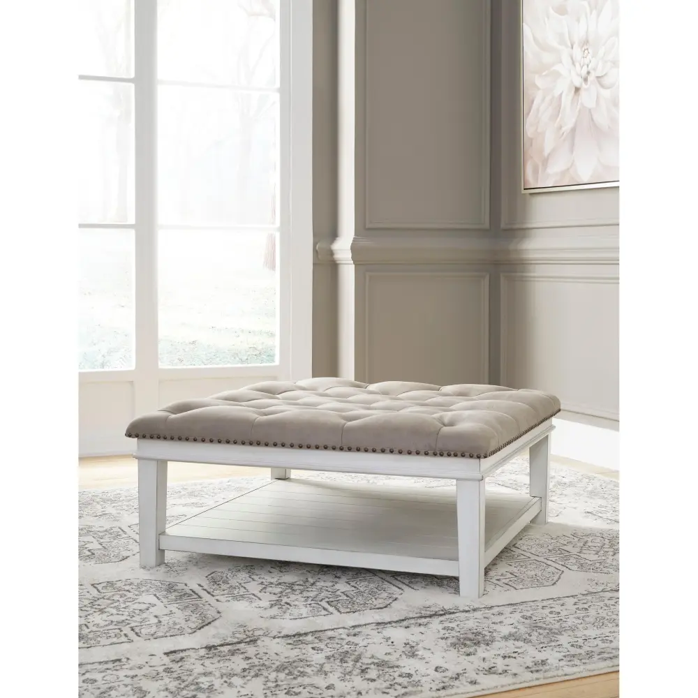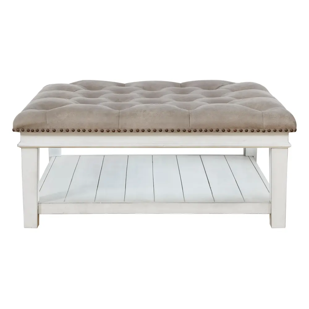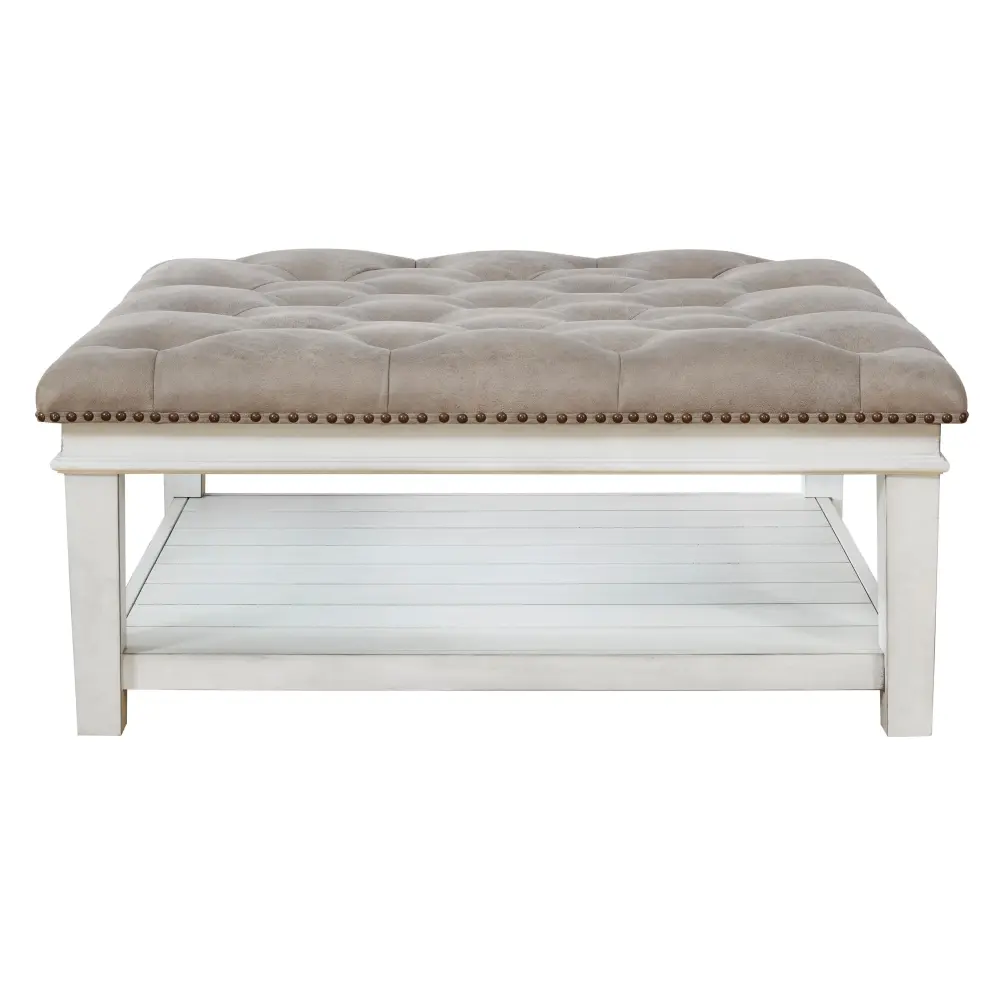 Ideal as a footrest or coffee table stand-in, this ottoman coffee table adds an all-purpose farmhouse touch to your living space. Crafted with comfort and convenience in mind, this square ottoman includes a faux leather button tufted seat with nailhead accents. Enhancing its casual appeal, a handy lower shelf houses throws, reading material and other essentials.