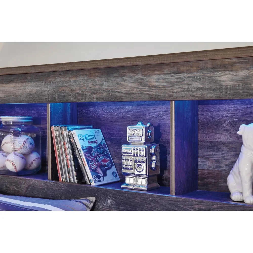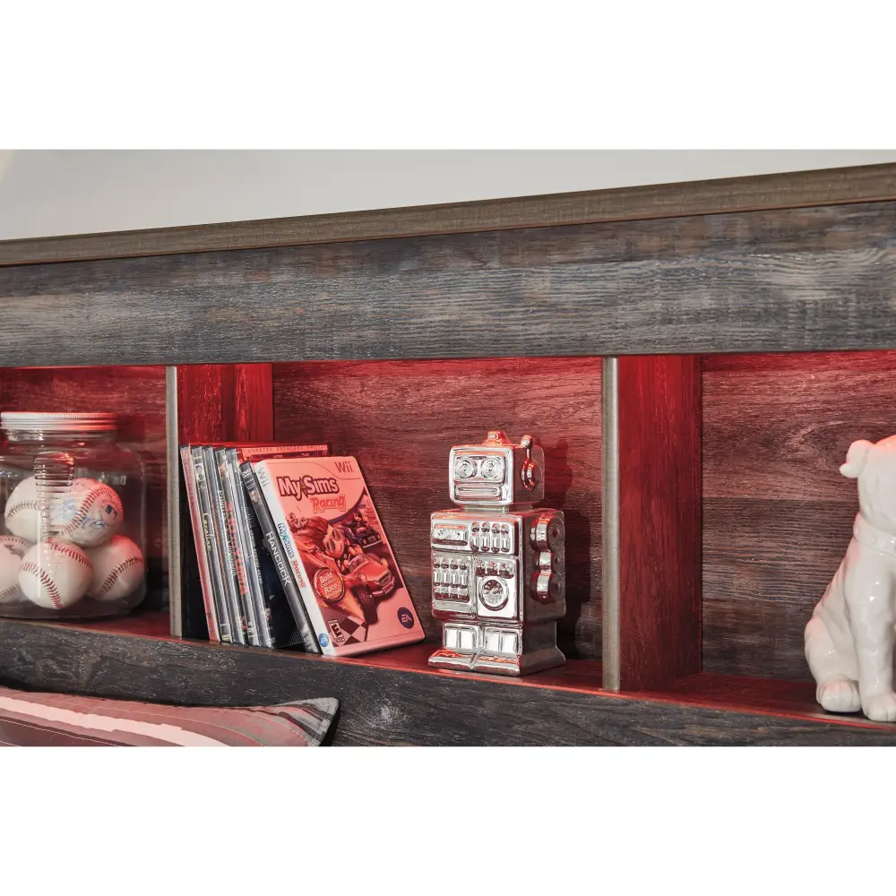 When merged in just the right way, rustic and industrial styles can make one happy marriage. Case in point: this full bookcase bed. A refined take on barn board beauty, its complex, replicated wood grain showcases hints of burnt orange and aqua green tones for a sense of weatherworn authenticity. Three open cubbies lined with a dimming LED light strip keep bedtime reads top of mind.