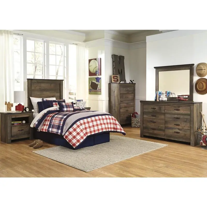 Whether she loves horses or he’s a cowboy at heart, the Signature Design Trinell twin panel headboard and frame matches their official sense of style. Rustic finish, plank details and nailhead trim are an homage to reclaimed barn wood, making for a sophisticated, vintage-chic look.