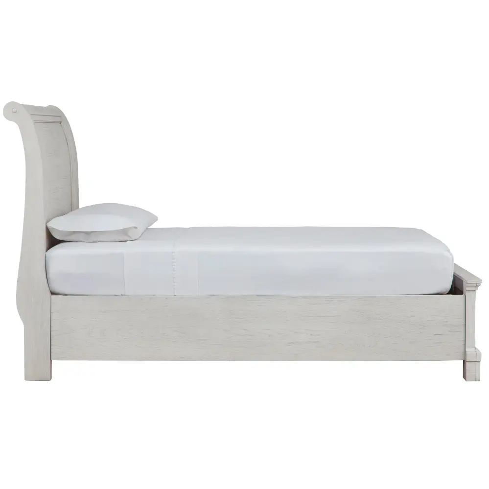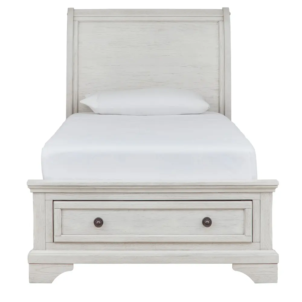 Elegant, timeless furnishings take your bedroom to the next level. Nothing does that better than this twin sleigh bed with storage footboard. The antiqued white finish with a wonderful grain texture radiates sophistication, while drawers with rich bronze-tone knobs add a sophisticated touch. Rounding things out, the subtle curve of the headboard keeps the look polished and poised.