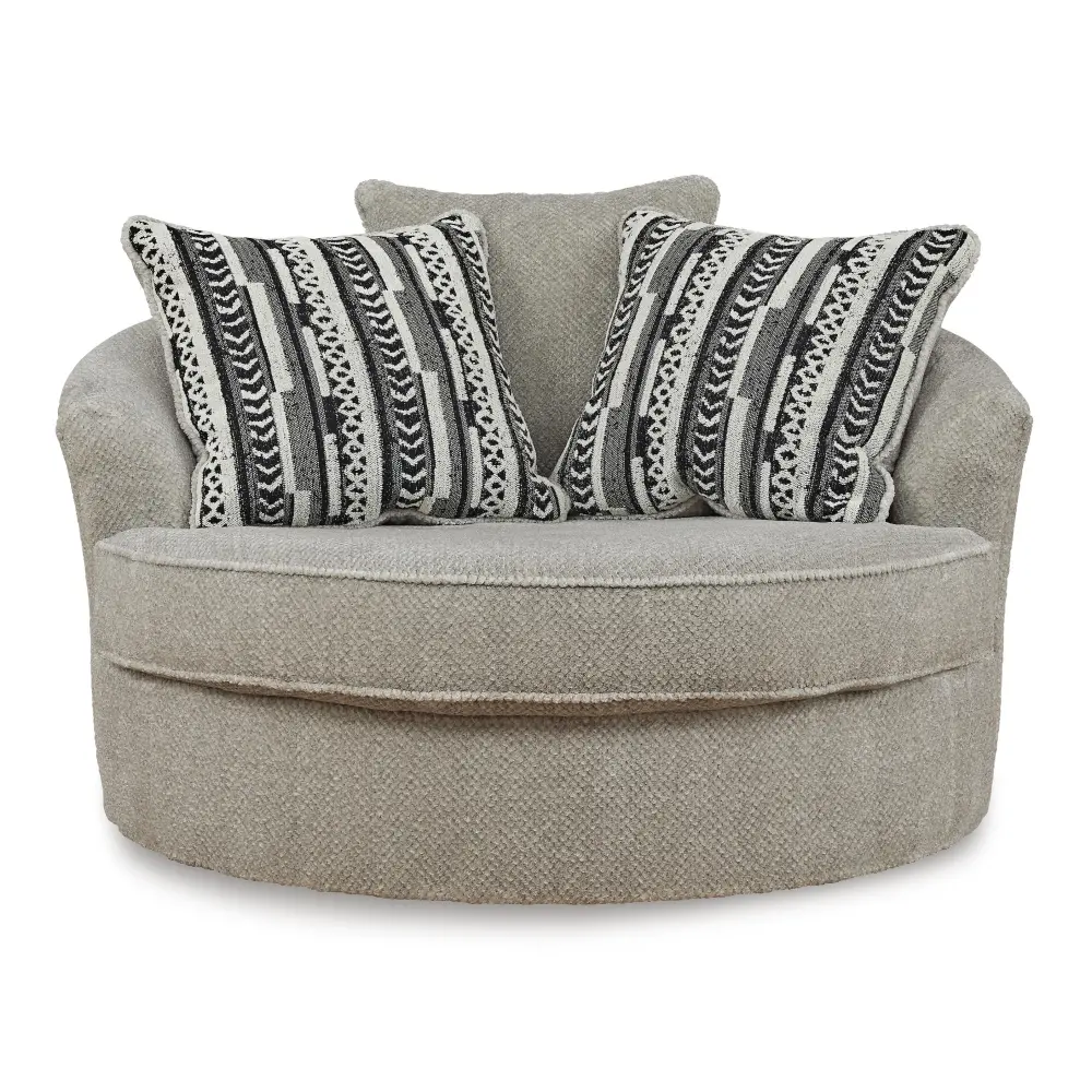 This substantial swivel accent chair caters to your need for contemporary comfort. Large in scale and decked out in feel-good fabric, it gives you space to sprawl out. And the 360-degree swivel motion makes it easy to view the TV or chat with others in your seating area. Quality time has never been so cozy.