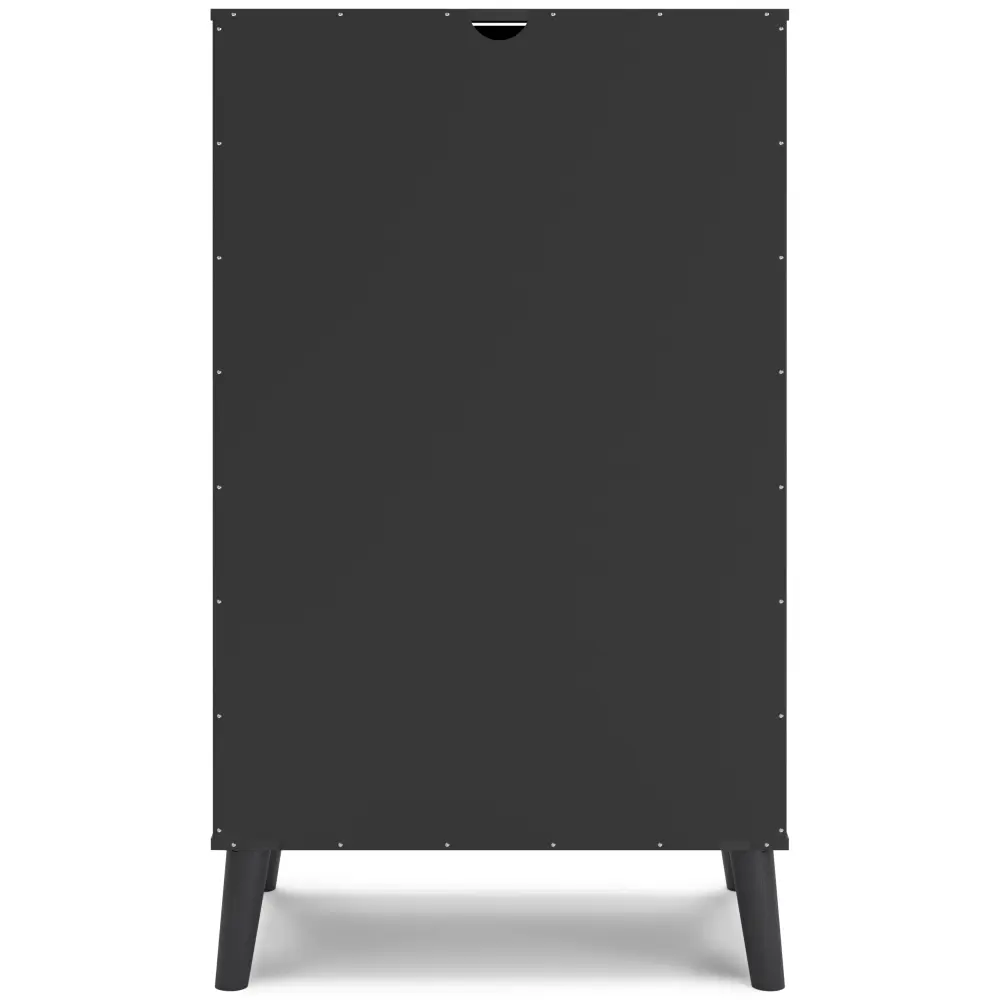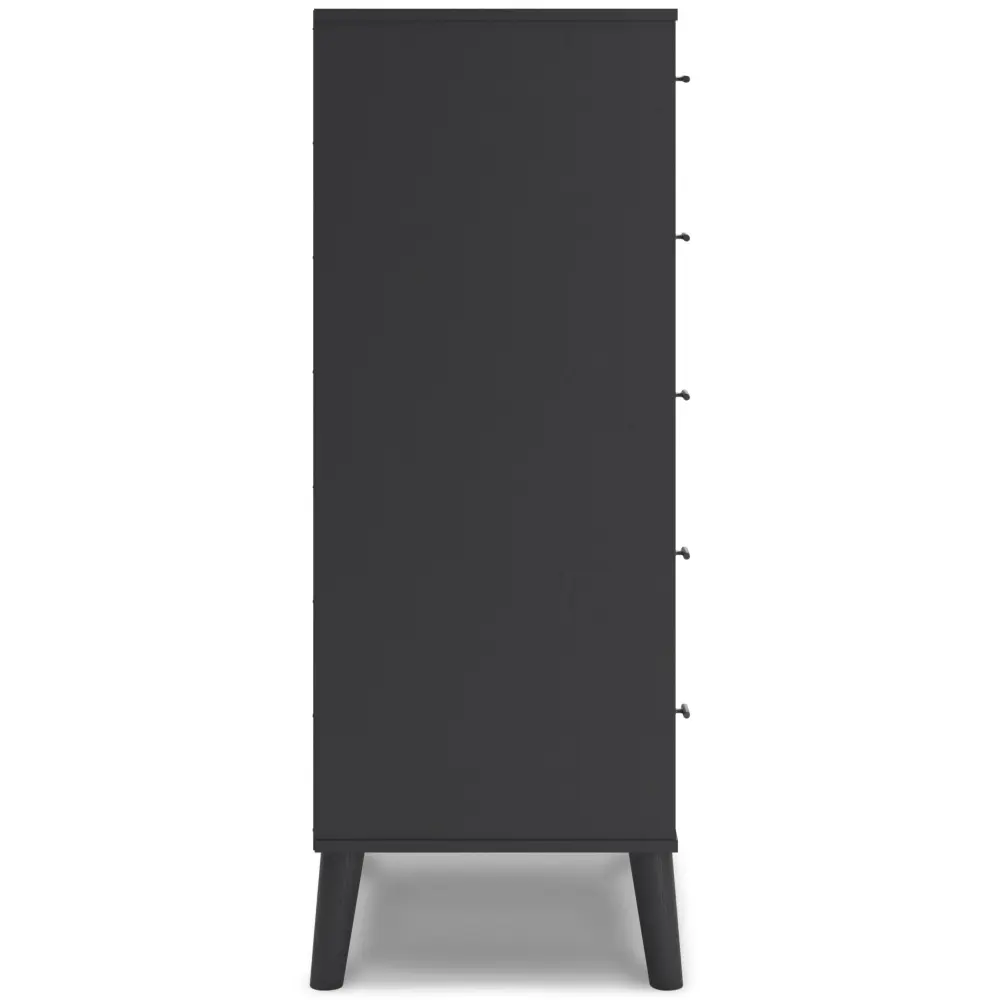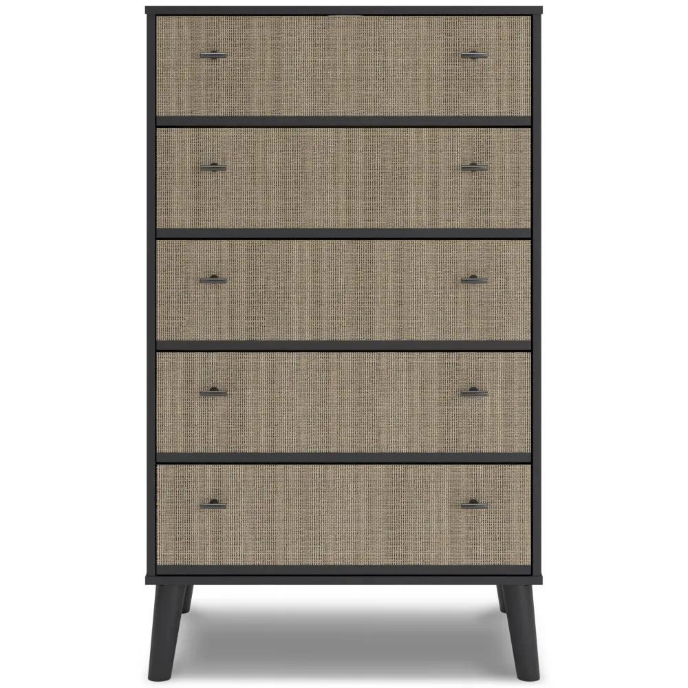 Put a retro spin on current trends with this chest of drawers. Its mixed-material look of matte black and replicated ecru cane brings a casually cool feel to your bedroom. Simple, sleek hardware and splay legs round out the urban meets mid-century vibe.