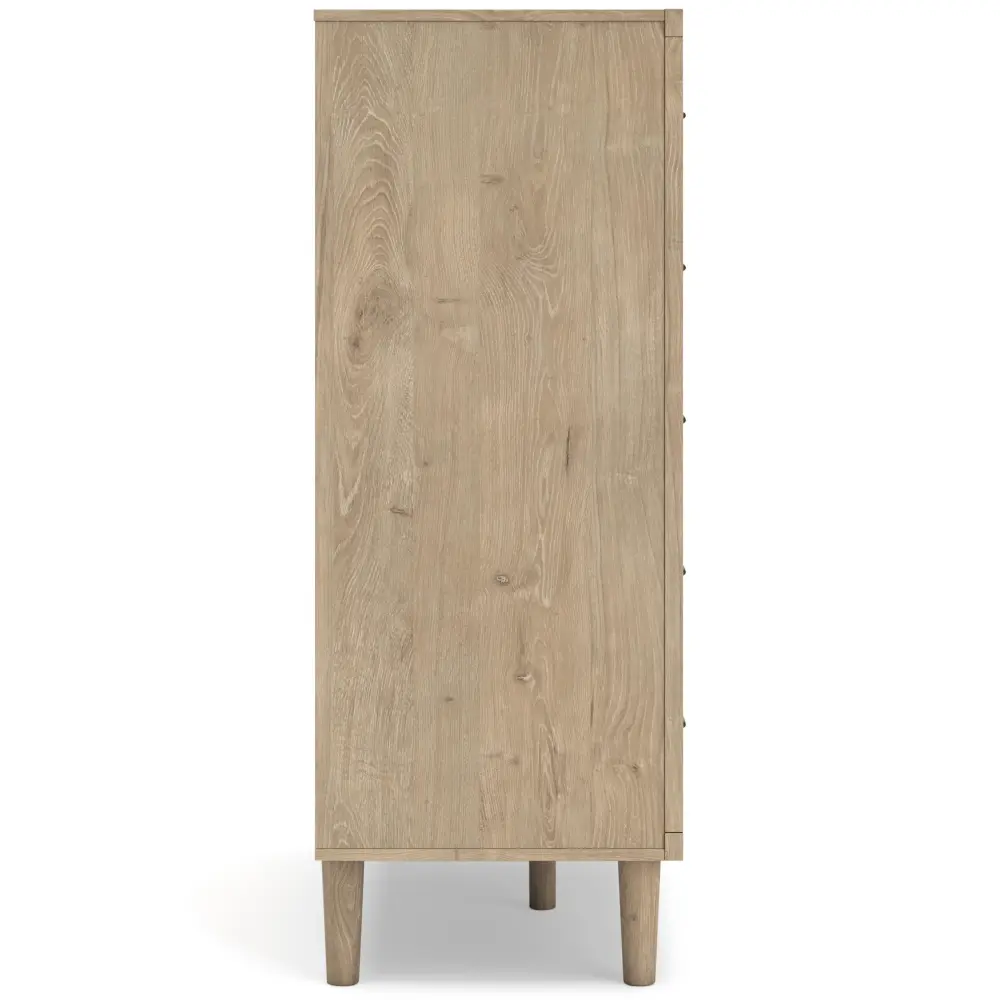 Clean-lined and contemporary—but far from stark—this chest of drawers is a fresh style awakening. Pairing a light finish with replicated oak grain and patterned beige details that replicate the look of cane, its mixed materials bring a naturally versatile vibe to your bedroom. Sleek, simple hardware plays exquisitely with the modern aesthetic. Prepare to have your mind blown by the vast universe of possibilities that await within the spacious drawers.