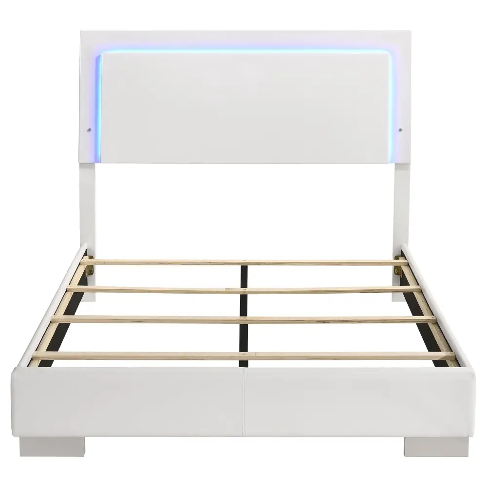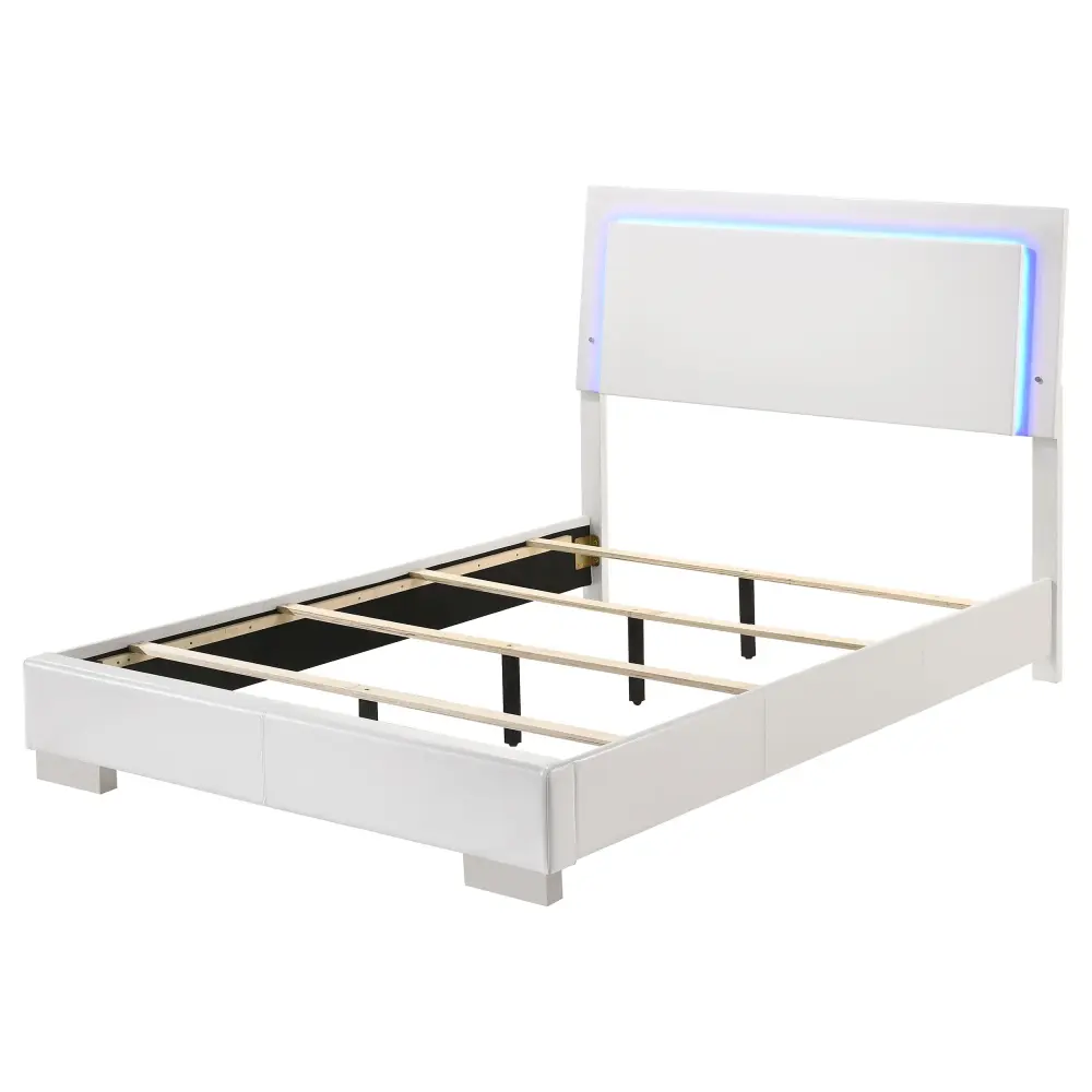 Put a cool factor to a teenager’s bedroom with this contemporary bed. This striking bed features an ultra-glossy white finish that complements any color palette while adding a crisp, clean look. Blue-hued LED lighting illuminates the headboard panel to place a glow for nighttime reading or studying. In addition, the base is wrapped in a padded, white leatherette. Chrome block style feet add to the sleek vibe of this modern bed.