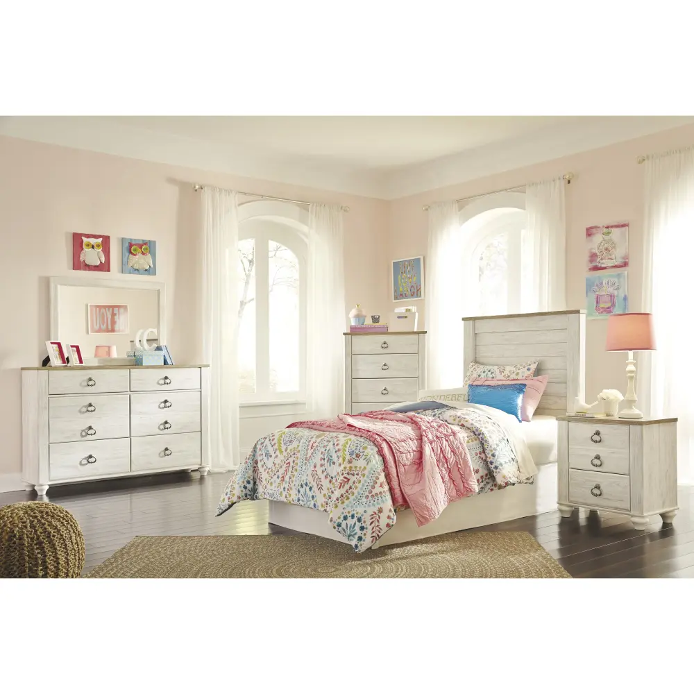 The ultimate look for a beach cottage or shabby chic inspired retreat, this twin panel headboard carries you away to a dreamy time and place. Its driftwoody whitewash finish is wonderfully simple on the eyes. Faux plank detailing incorporates a classically rustic touch that’s so homey and comforting. Mattress, bed frame and foundation/box spring sold separately.