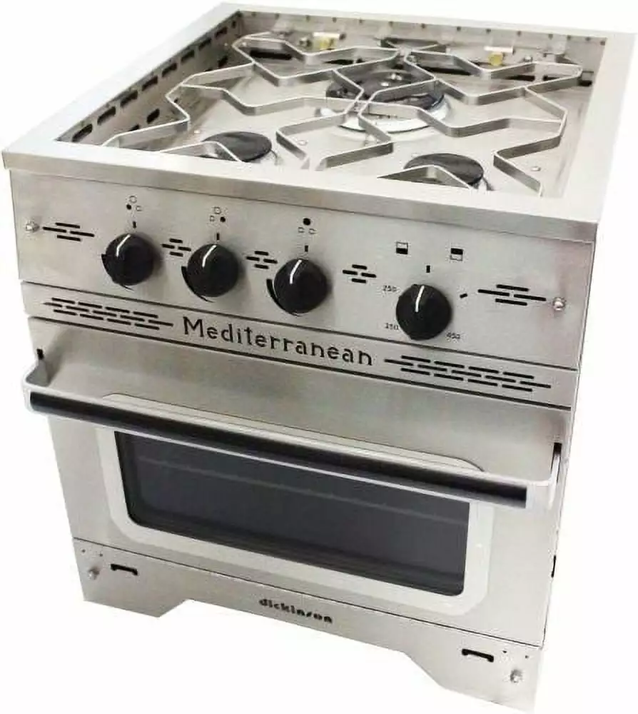 100% Stainless Steel. Thermostatically controlled oven complete with broiler. Burner Safety Flame-out. Pot holders. Removable cutting board included. No electrical connections. Fuel Type: Propane. Width: 20.375". Depth: 20.250". Height: 21.750". Usable Oven Volume: 35 L. Burner Output:. Large Burner: 11.000 BTU. Small Burners: 7.000 BTU each. Broiler: 7.000 BTU.