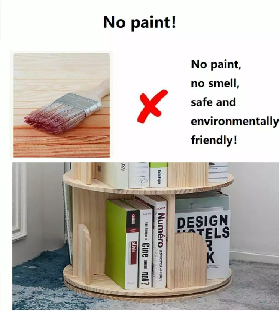 Product Description SIZE The total height of the bookshelf: 62.6 inch (159cm). A total of 5 layers. each layer height: 11.6 inch (29.5cm). Diameter: 17.3 inch (44cm). Super large capacity Takes up very little space. Can be placed in any corn.er of the room. But it can make every room look like a small library. Pretty stable Rotating chassis Once assembled. it is very stable. During the entire rotation process of the bookshelf. the bookshelf will not have any shaking. Free assembly mode It can be assembled into a 1-5 layer bookshelf at will. Space saving Takes up very little space. Can be placed in any corn.er of the room. But it can make every room look like a small library. Premium grade wood Made of pine wood. no paint. no smell. hand polished. no burrs. Brief content visible. double tap to read full content.Full content visible. double tap to read brief content.