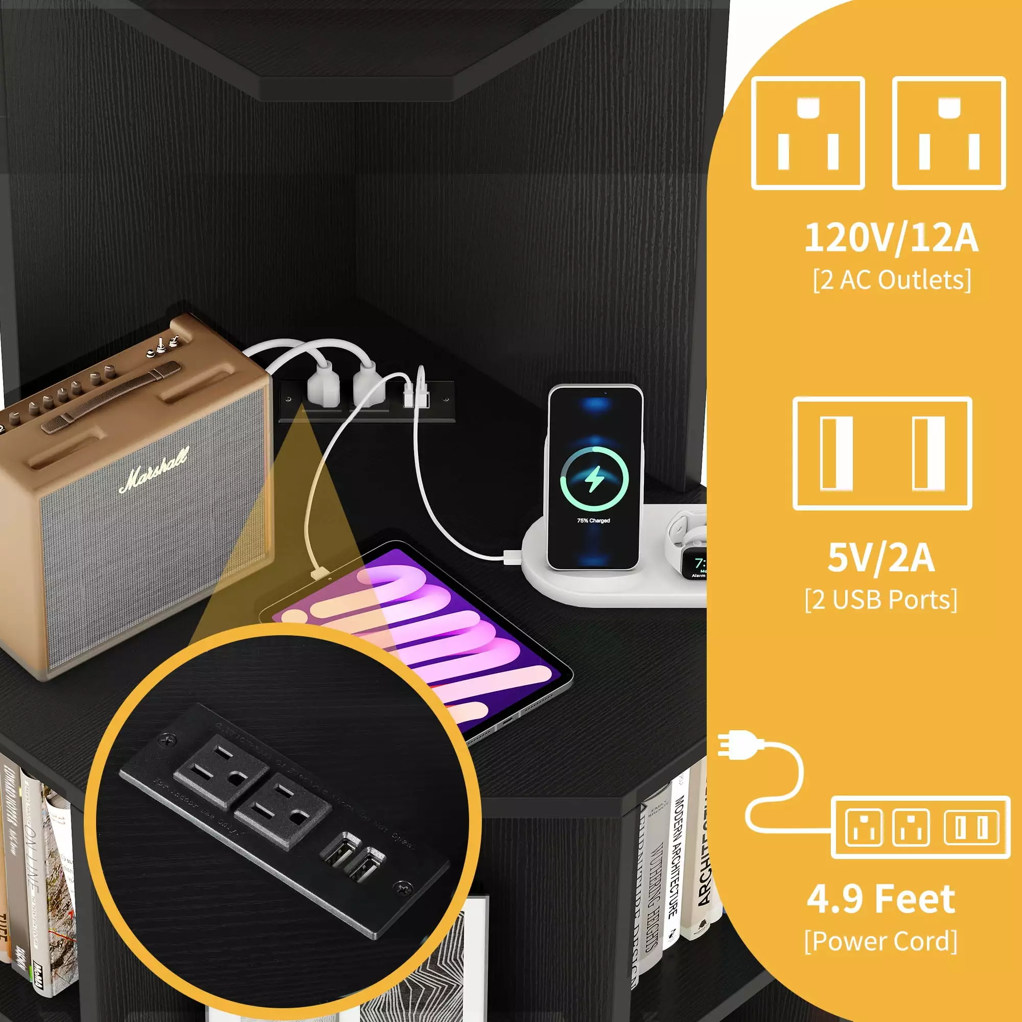 Introducing the 5-Tier Corner Shelf. a space-saving storage solution perfect for your bedroom. living room. or study room. This unique angle design maximizes corner space while providing 12 storage spaces for books. decor. or even a corner bar cabinet. The chipboard construction ensures stability and durability. while the non-slip foot pads and two metal anti-tip brackets offer added safety. Plus. it features 2 built-in USB charging ports and 2 AC outlets for convenient device charging. Get organized with the 5-Tier Corner Shelf!