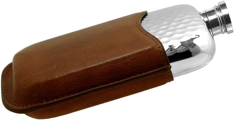 - 6oz pewter hip flask with genuine tan leather pouch