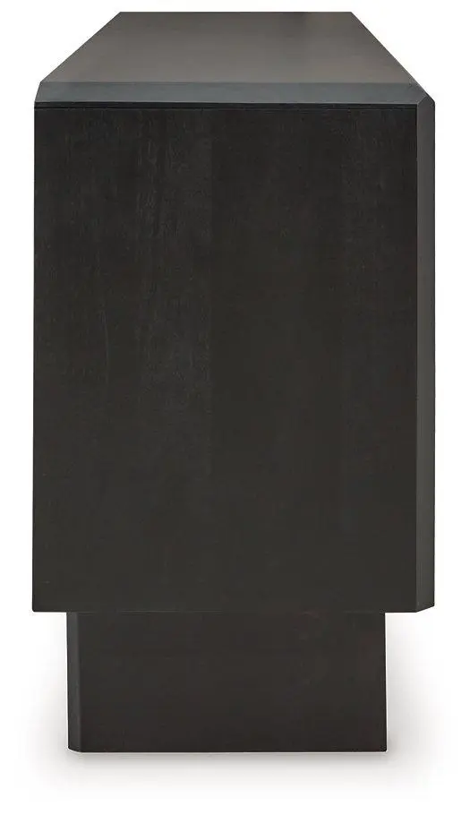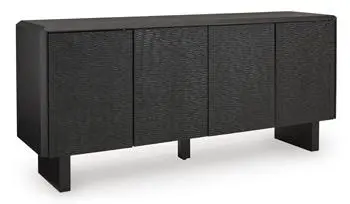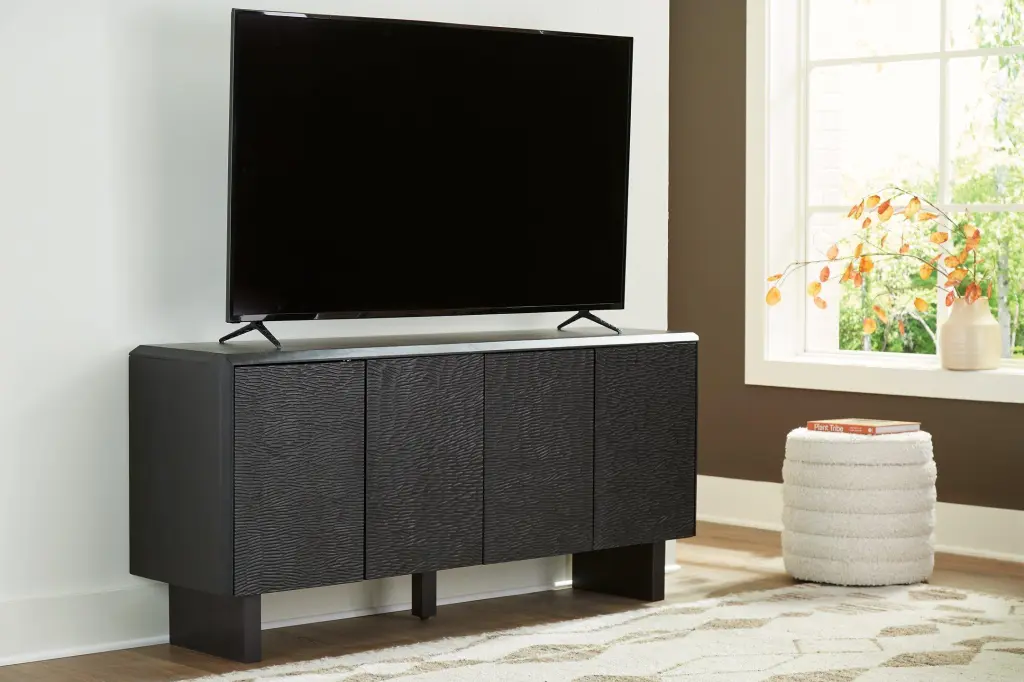 Function and style merge perfectly with this accent cabinet. Crafted of solid wood in a black finish, this piece makes a great case for fresh contemporary design. Doors with a carved pattern open to reveal shelving, while beveled edges add a distinctive touch. Whether you use it for storage or as a TV stand, your love of unique style will shine front and center.
