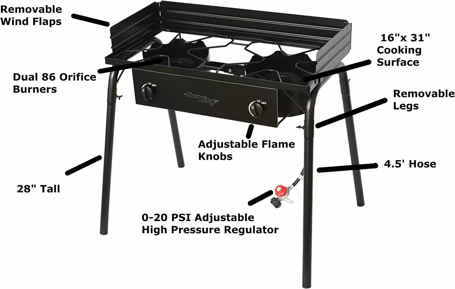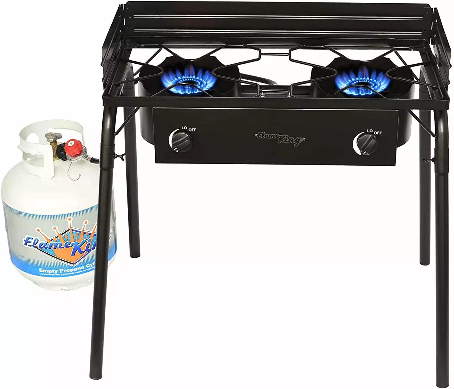The Flame King 2 Burner Stove is the perfect solution to your outdoor cooking needs. Take it camping with you or have it as an emergency backup in the event of a home power outage. Feel reassured in knowing you can cook in whatever extreme situation you find yourself in. The Flame King Standup stove is a true outdoor appliance with incredible performance capabilities. Get the Flame King 2 Burner Stovetop and happy cooking. Flame King 20 lb tank and cooking pot are NOT included.