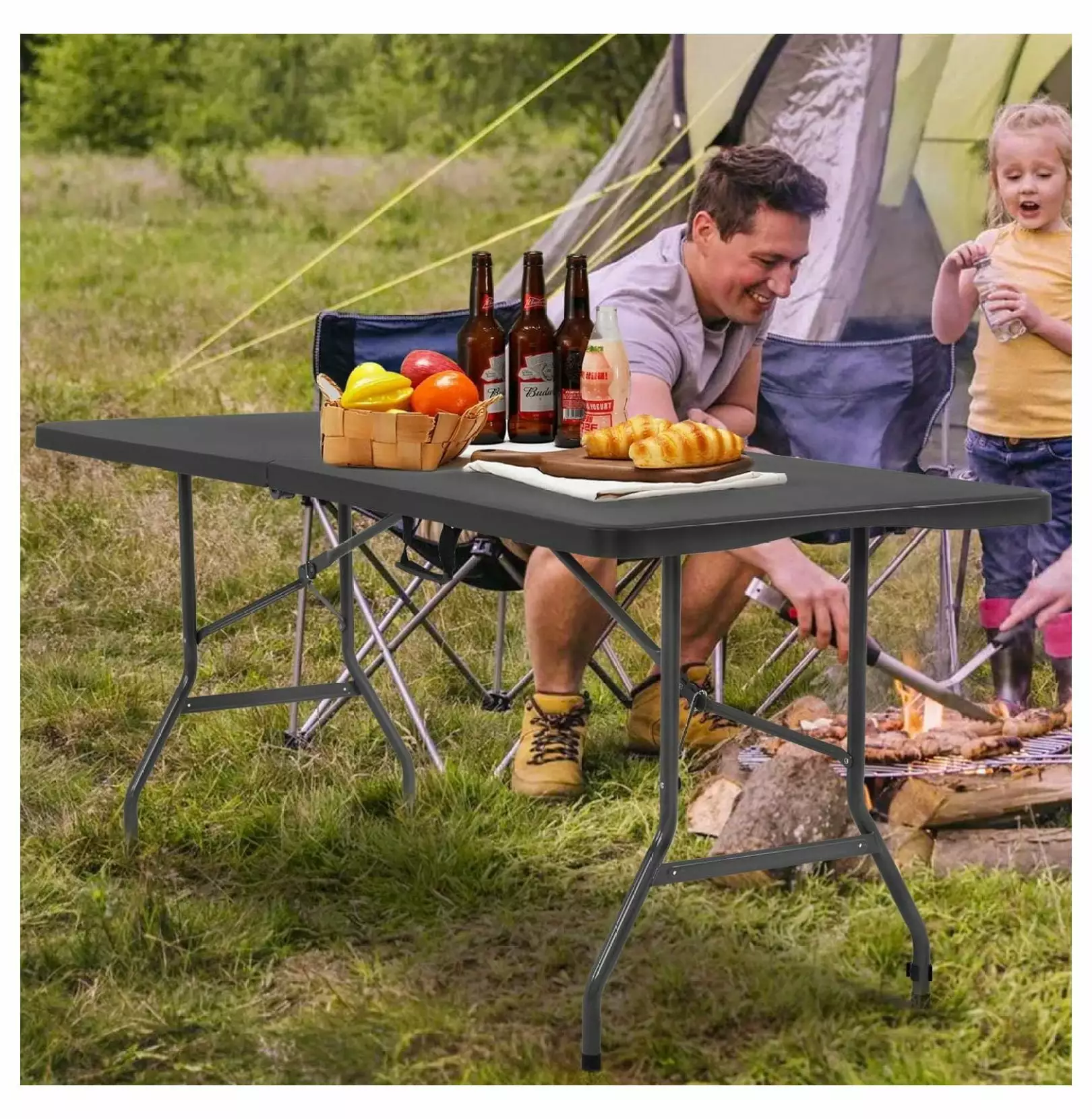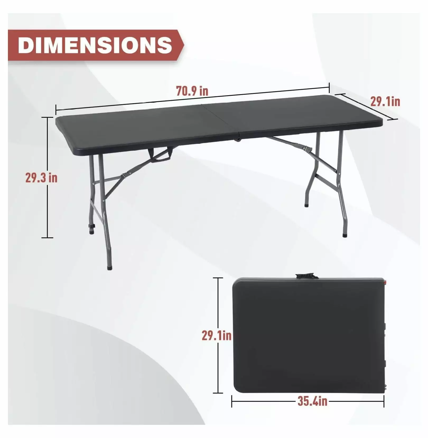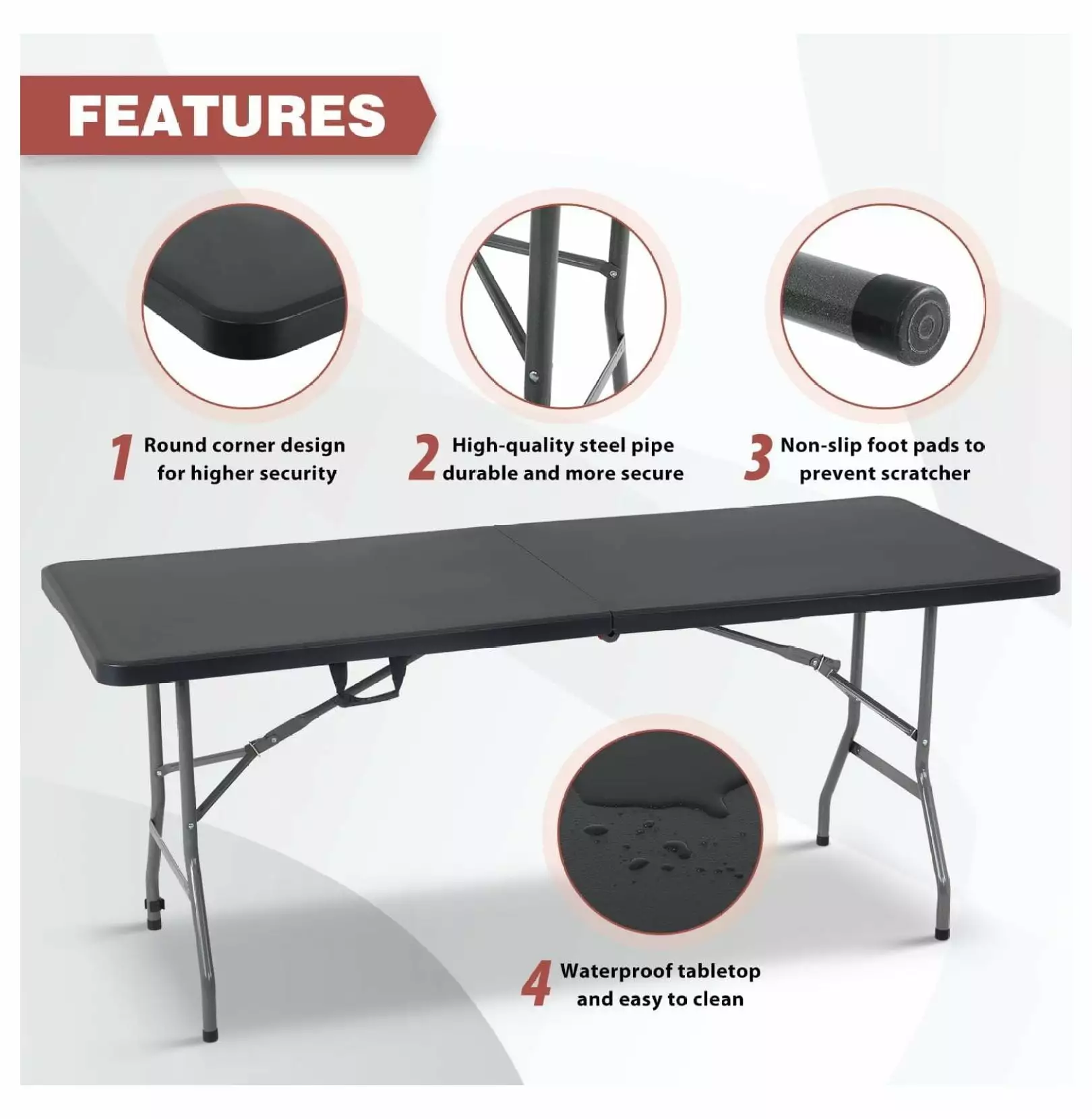 - This 6 ft folding table comes with side locks and handles. which can be folded from the center and fastened with a safety clasp. convenient and compact. The side design handle makes the camping table easy to carry out. The table can be stored in a compact space when not in use.
