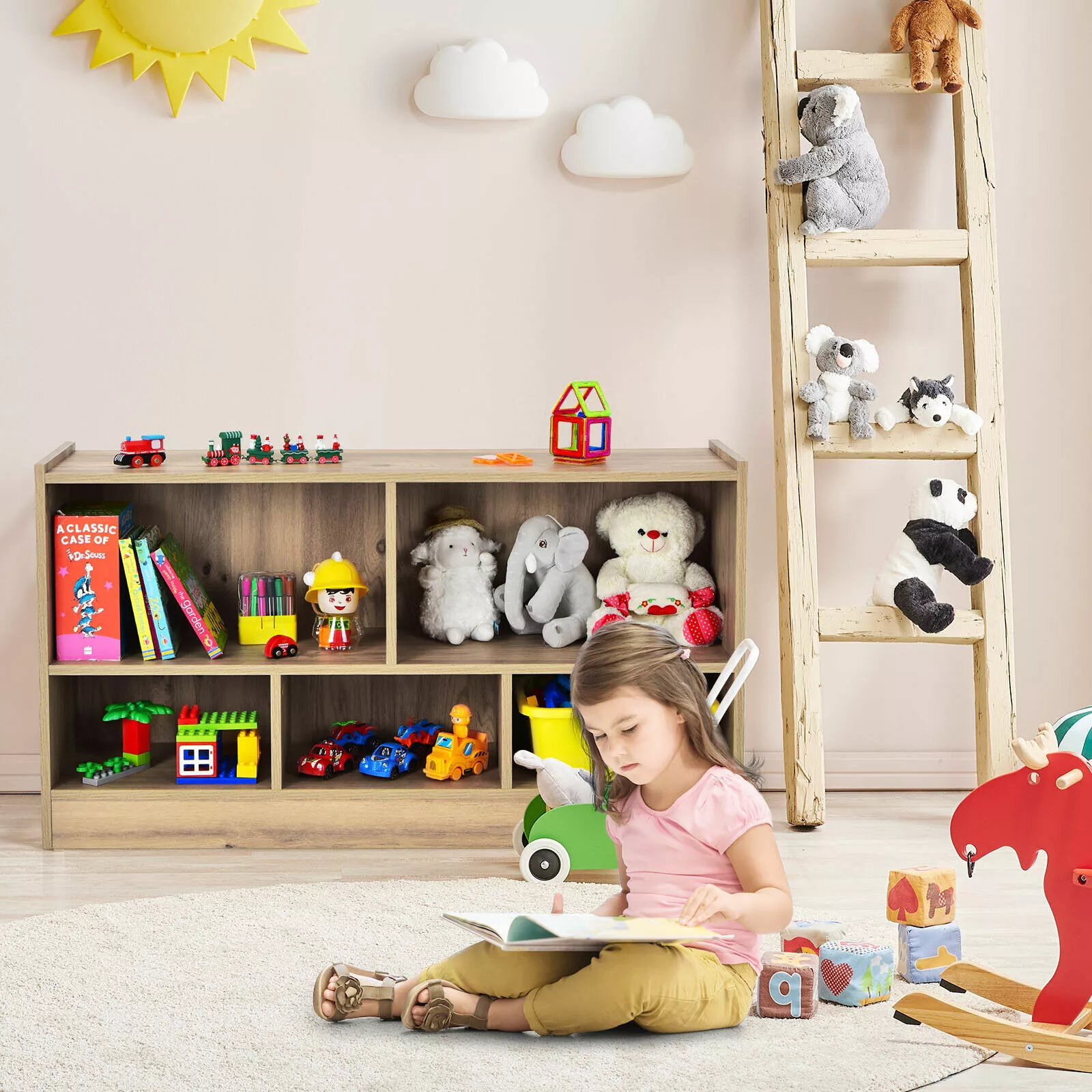 Crafted from premium engineered boards that meet TSCA standards. it ensures both safety and durability. This storage cabinet features five 11-inch deep compartments. providing ample storage for toys. books. art supplies. and game supplies. Designed with reinforced back buckles and non-slip foot pads. it offers stability and can be placed in any corner of the room. The height of each cube is specially designed for our little users. making it easy for them to retrieve and put items back. fostering good organizational habits.
