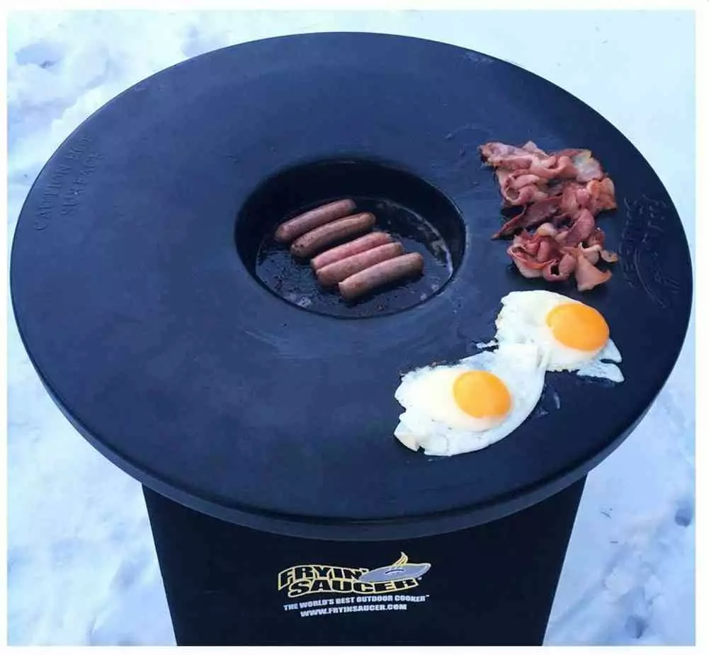 The one and only Fryin’ Saucer. This package includes the saucer. carrying bag. stand. burner. gas regulator. wind ring and burner support bar. Snaps up in an instant. and gets you cooking in less than ten minutes. Get ready to cook eggs. bacon. chicken wings. pasta. hot dogs. corn. fish. and even burgers all with the amazing Fryin’ Saucer. The unique sloped surface allows oil to drain off food back into basin. The unique hot rim stays hot until everyone is ready to eat.