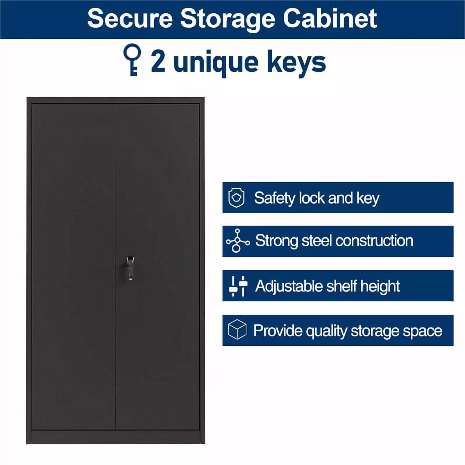 High-quality & Sturdy Construction: Whole-in-one reinforced heavy duty metal frame.solid and strong.It is made of reinforced steel frame construction and a corrosion and stain resistant powder coat. It is a great storage solution. Spacious Storage Space: It has lots of room to organize your belongings. Use it to store household goods. tools. cleaners. gardening supplies. etc. It is a great storage solution for any garage. kitchen. utility room. office. laundry room. Adjustable Shelves: This 2 door metal storage cabinet with 4 adjustable shelves and 5 shelf storage space.each shelf can hold up to 77lbs. guaranteeing maximum adaptability and convenience for your own unique storage and organizing needs. Secure Privacy Lockable System: The locking system of lockable storage cabinet with 2 swing doors wearing a handle bar and 1 lock & 2 keys to help keeping your office supplies. like folders. documents. as well as your personal belongings safety and in order. Advanced knocked-down structure. and assemboled in 5-10min. The material is high quality cold rolled steel. Durable friendly and environmental paint finish; electrostatic powder coating. Connection parts and supporting accessories resist grind and pressure.