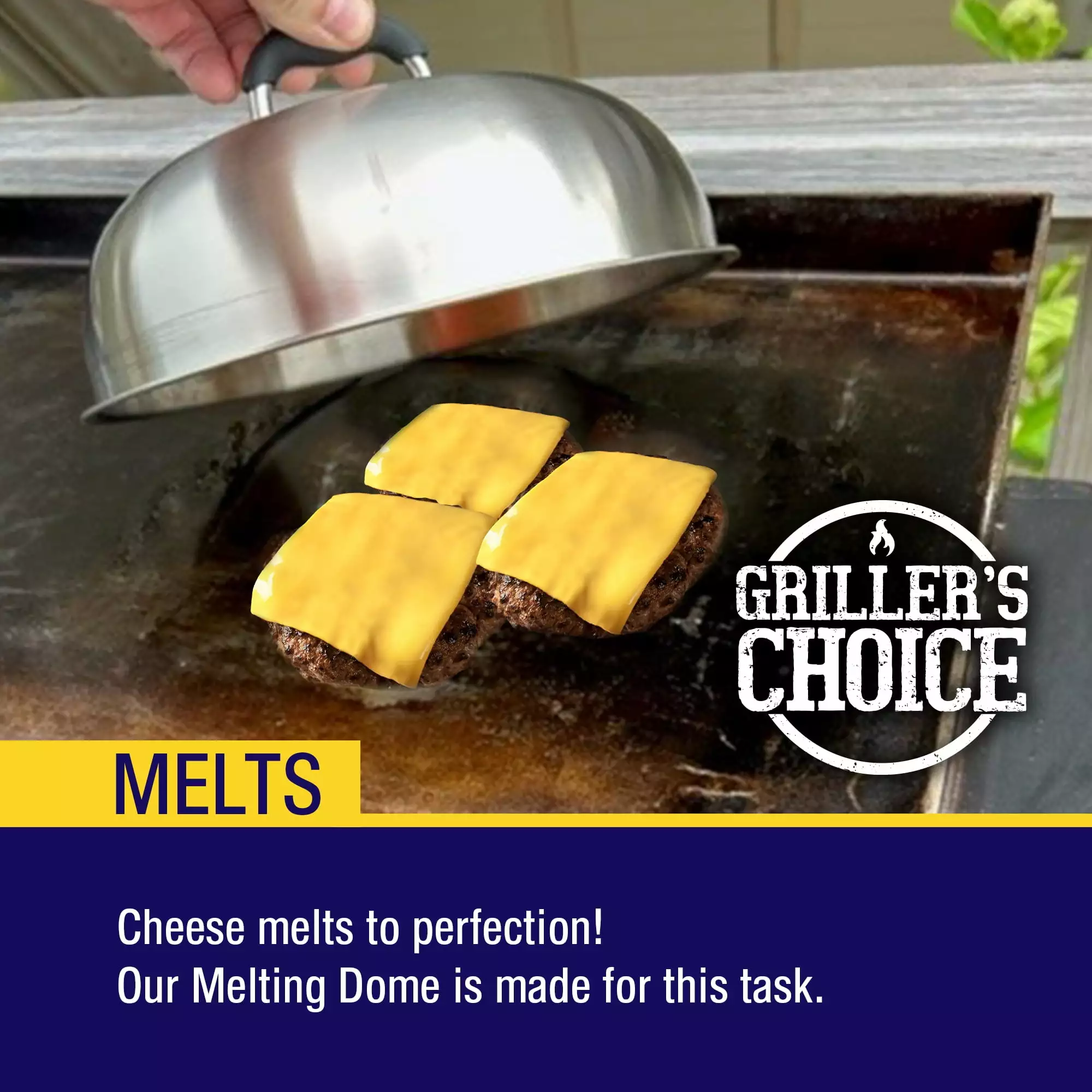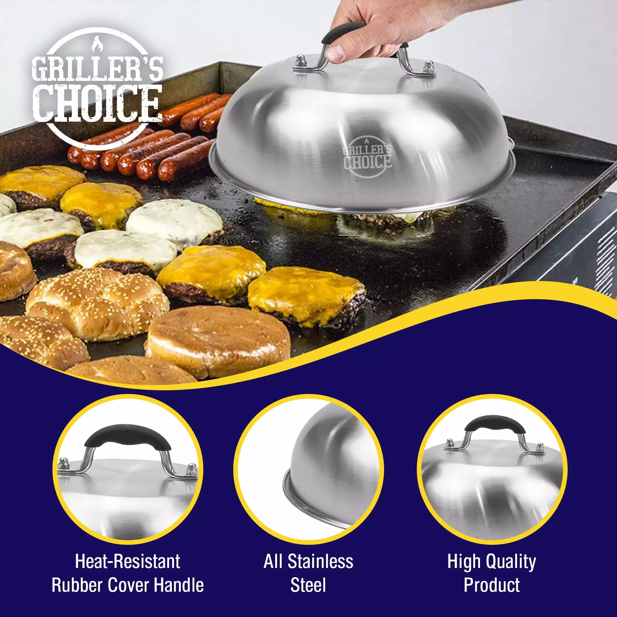 Welcome to the ultimate grilling experience with Griller’s Choice Dome and Press Set – your indispensable flat grill accessories. This set is a must-have for grillers. cooks. griddle grill enthusiasts. and everyone who loves outdoor cooking. It’s perfect for camping. entertaining. and even for your daily cooking needs. The set includes a durable cast iron smash burger press and a stainless steel dome. The cast iron press doubles as a superb griddle press for smash burgers and a bacon press for the griddle. It’s designed to give you that perfect burger smasher tool experience. creating mouth-watering burgers that your friends and family will love. The smash burger press. crafted from cast iron. is your ultimate smashburger press. Whether you’re making a classic burger or experimenting with a Japanese burger recipe. this press will deliver excellent results every time. The press also serves as a final press. providing the finishing touch to your burger. ensuring it’s cooked evenly and to perfection. The steaming dome is another reason why this set stands out. It’s not just a griddle dome cover; it’s also a melting dome. perfect for melting cheese on your burgers or grilling vegetables. Made from stainless steel. the dome traps heat efficiently. reducing cooking time and improving the taste of your food. And let’s not forget the additional uses that make this set a versatile cooking tool. The hamburger press for the griddle can be used as a ham press. while the dome can also function as a grill dome. and the iron press as a cooking press. So. why wait Improve your grilling game today with this all-in-one Griller’s Choice Dome and Press Set. Whether you’re a seasoned griller or just starting out. this set is a game-changer. Plus. it makes a great gift for any grilling enthusiast or aspiring cook. Remember. the best meals are the ones made with love… and the right tools!
