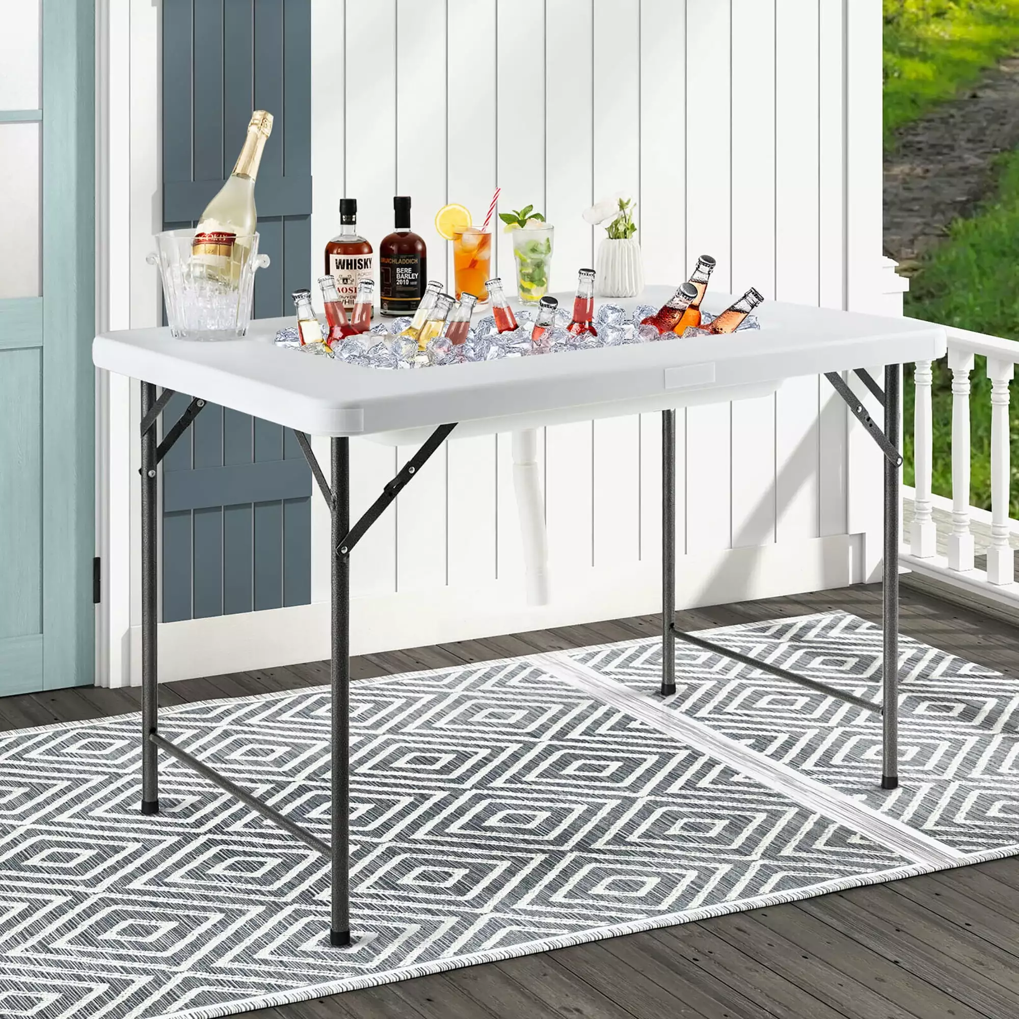 Our ice cooler table is equipped with a large capacity ice bin (32”(L) x 17.5”(W) x 4”(H)). which perfect for chilled beverages or food. Its drainage hole and hose help to guide the melted ice to drain. What’s more. made of high-quality HDPE. the tabletop guarantees great water resistance and excellent durability. Supported by 4 metal legs with foot pads. the indoor & outdoor ice cooler table ensures a high load-bearing capacity. Besides. the lightweight and folding design keeps it easy to store and transport. With table skirt. this versatile ice table is ideal for outdoor parties or weddings.