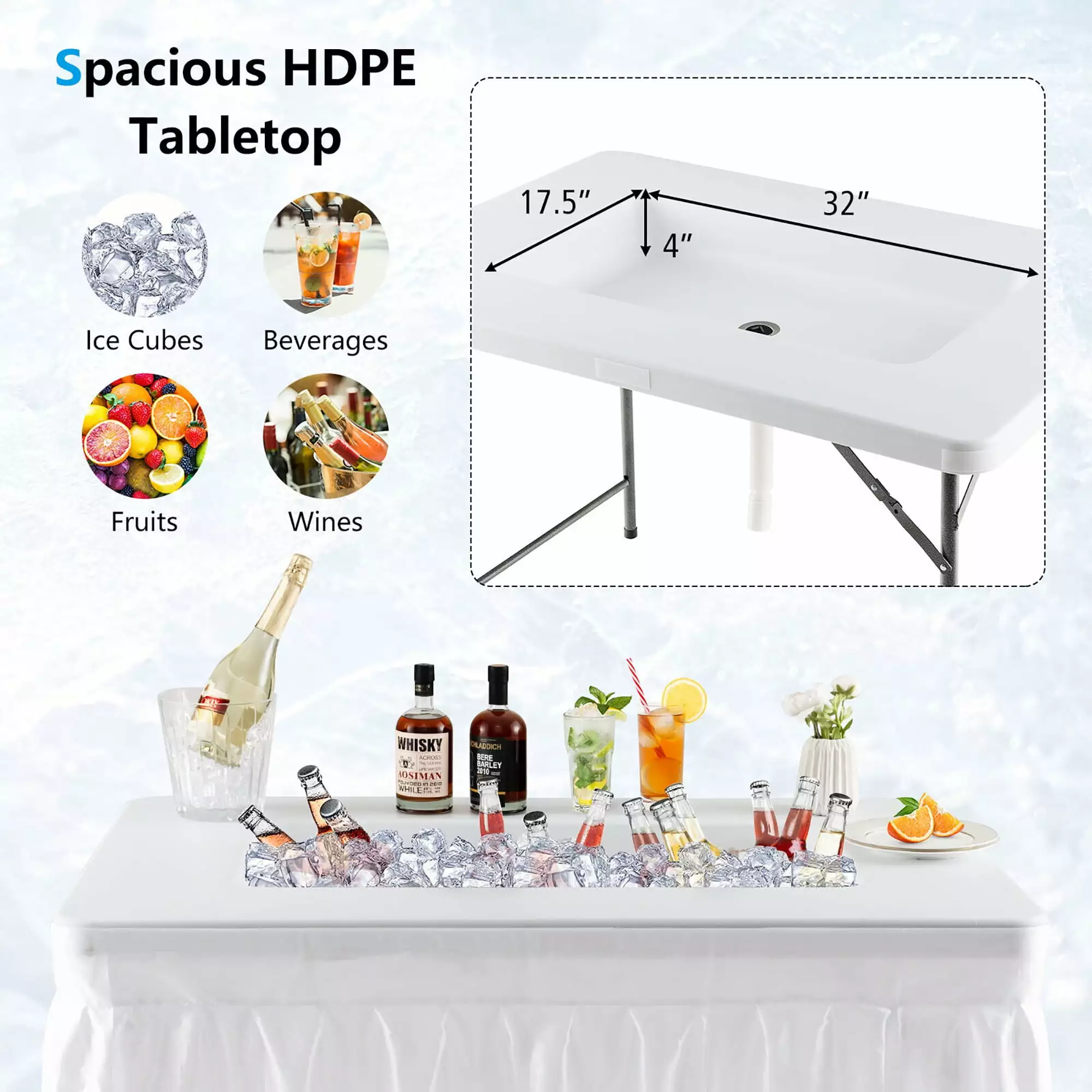 - Spacious HDPE Tabletop: Featuring a 32”(L) x 17.5”(W) x 4”(H) ice bin. our wide tabletop provides ample storage space for lots of ice cubes. beverages. fruits or wines. You can use it to keep your drinks or food cooled and fresh. Plus. the open tabletop also allows you to quickly reach for what you need.
