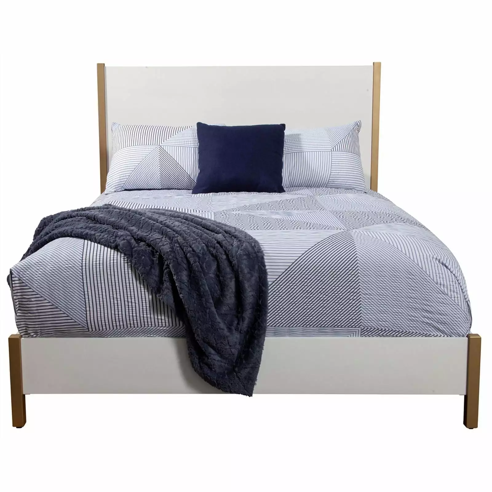 Sink into comfort in the Home Square Upholstered Panel Bed. Its clean lines. and gold finished legs raises the bed off the floor for an airy feel that fits right into any contemporary styled room. The bed boasts a simple headboard in an upholstered neural white fabric. The Home Square Panel Bed utilizes a combination of mahogany solids and veneers in its construction. A box spring is required with this bed. Available in multiple sizes to accommodate most room settings. Coordinates with other pieces in the Home Square bedroom collection sold separately.