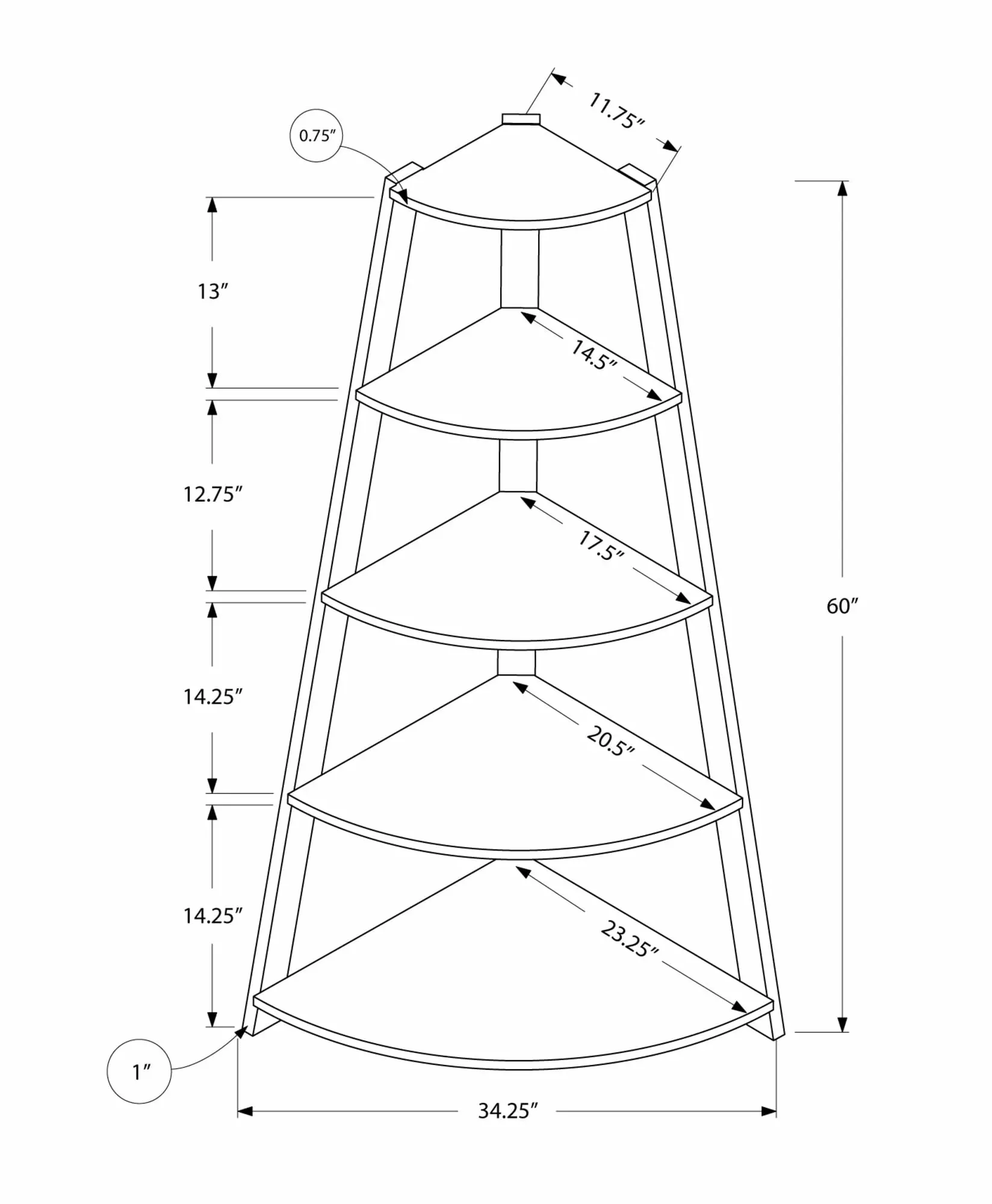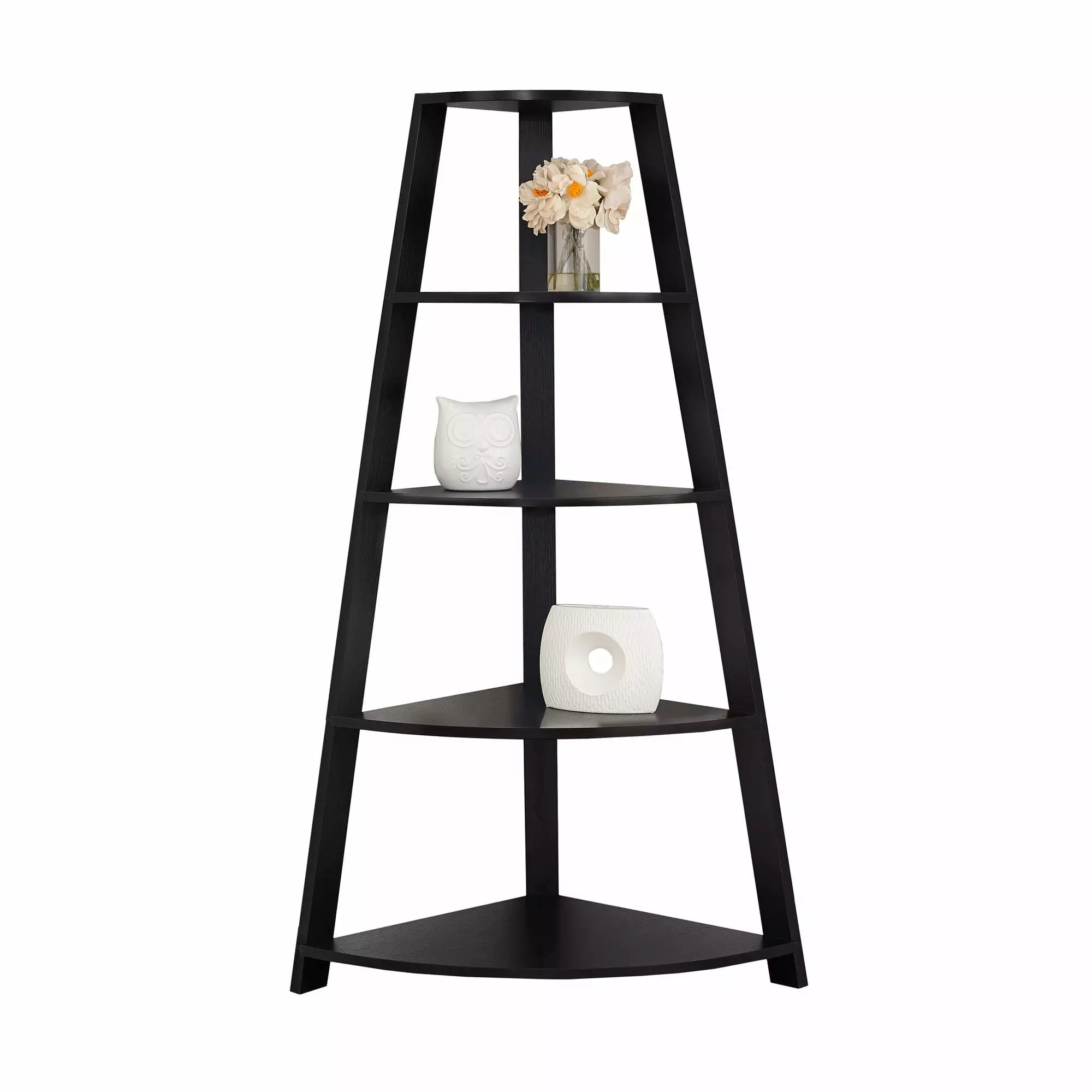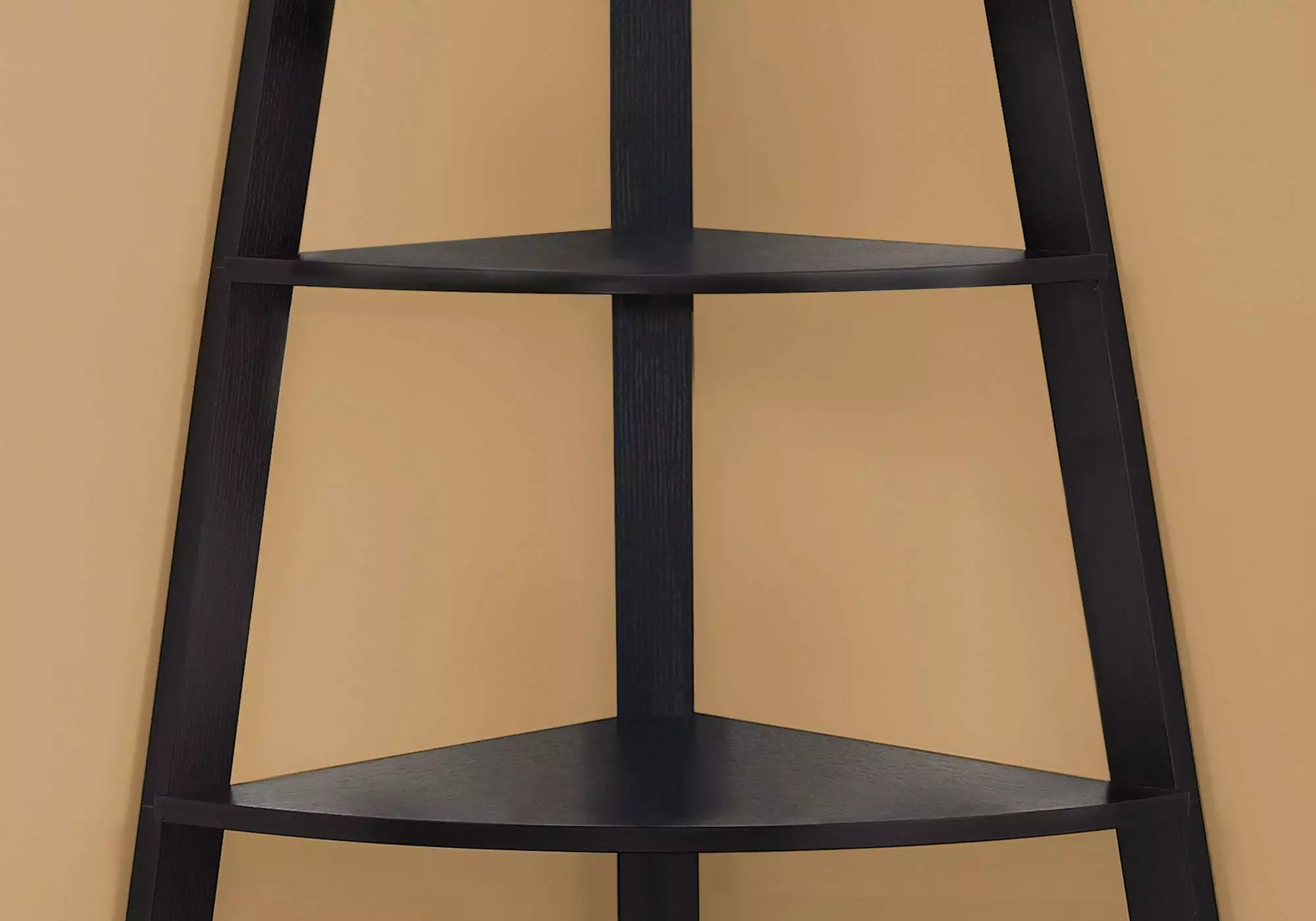 This noir black bookcase corner accent shelf is a fresh and updated way to help you keep your space neat and organized. Crafted from sturdy particleboard. in a black finish. this versatile shelving unit can be utilized for many years to come. Great to use independently or pair with additional units to create a different look and add even more storage. Carefully crafted to fit in tight spaces. you can turn almost any nook into a stunning display showcase for books. plants decor and more. 60" H x 24.25" W x 34.25" D