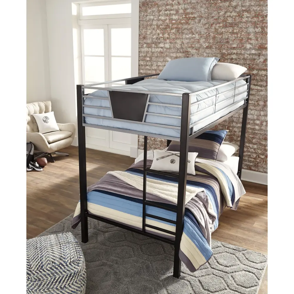 Step up to a higher level of style in kids bedroom furniture with this twin bunk bed. A cool response to the trend in modern industrial design, this metal bunk bed sports a black and graphite for a welcome touch of maturity.