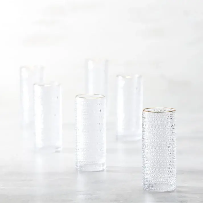The Jupiter Clear Gold Rimmed Highball by Fortessa brings elegance and sophistication to your table with vibrant gold rim and delicate beaded detailing.