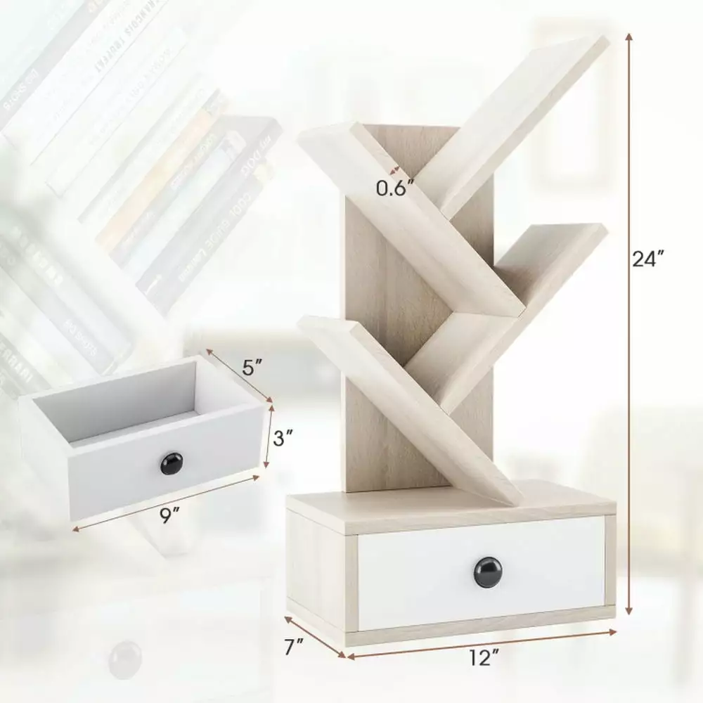 -Adorable tree shape makes it become a unique decoration-5 shelves in total helpful to eliminate annoying chaos in your home-Engineered wood drawer provides private storage space-Compact size occupies a corner space and ideal for desktop uses-Rounded knob convenient for opening and closing the drawer-Suitable for study bedroom living room office entryway and more-Easy installation with a detailed manual saves time