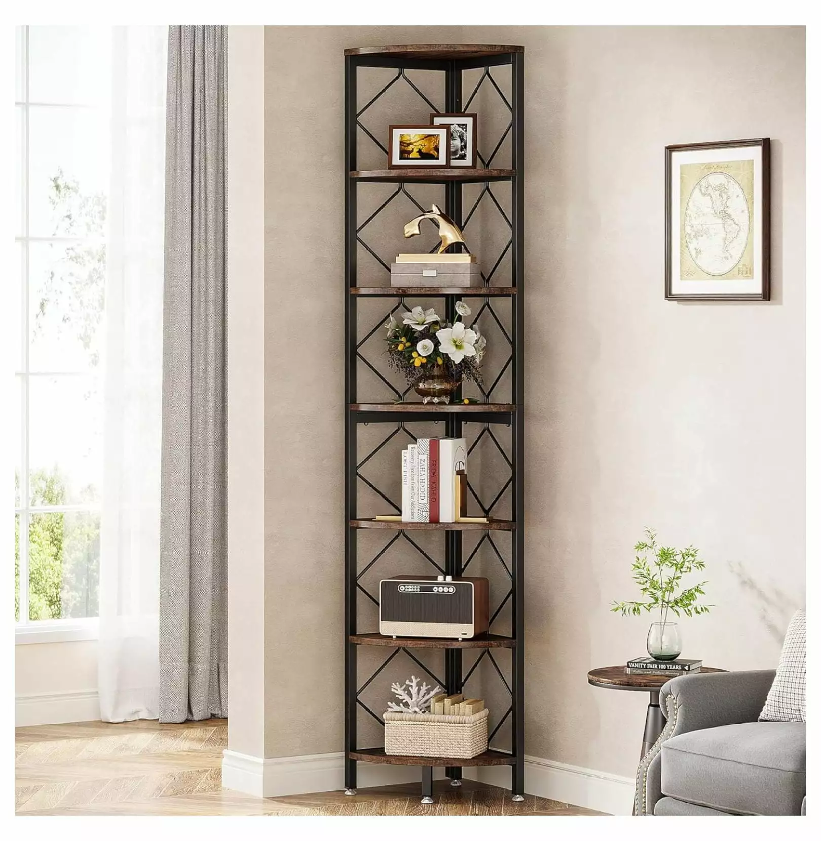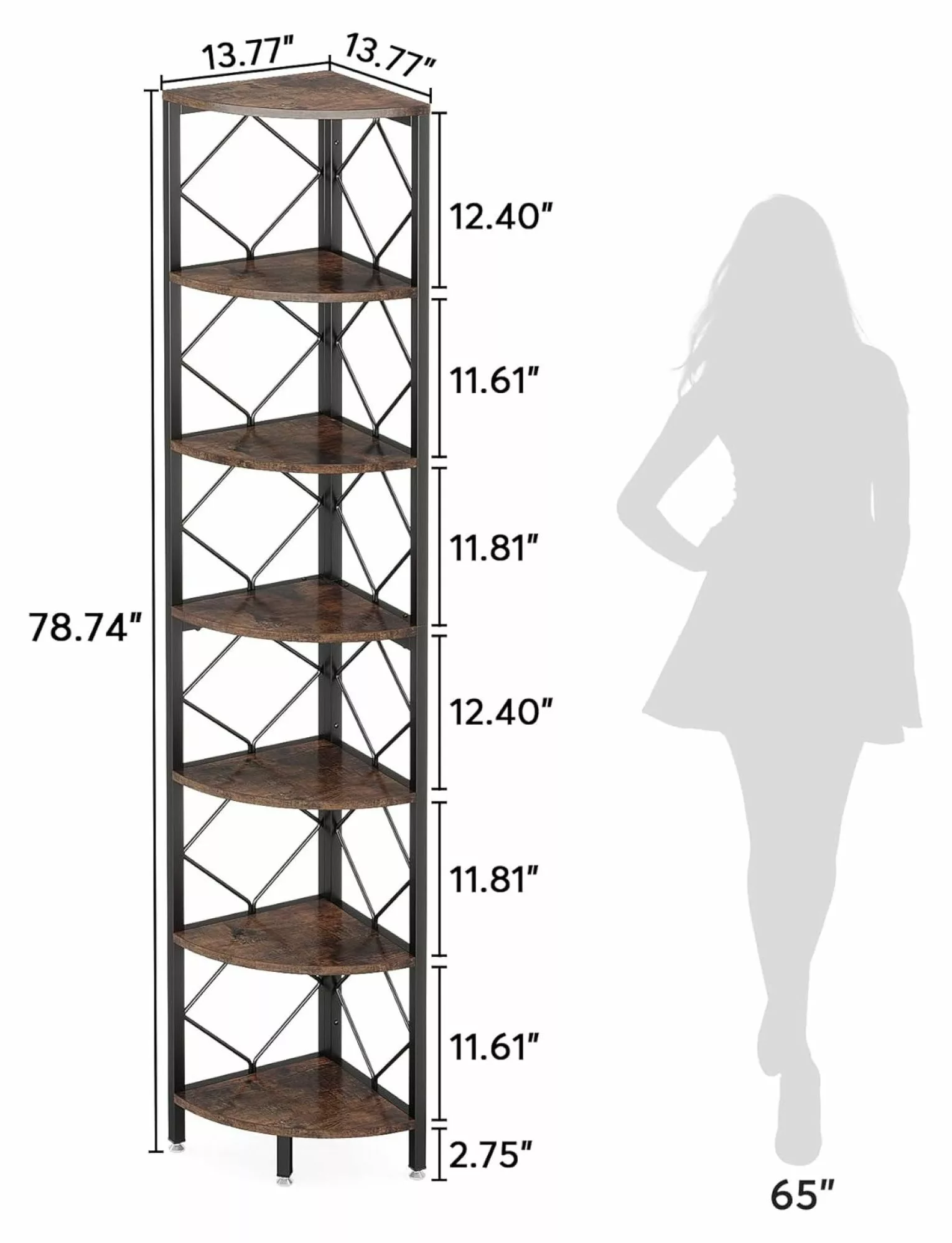 - [Maximize Corner Space]: Our 7-tier tall corner shelf is designed specifically for corner small spaces. making it an ideal space-saving solution for utilizing often overlooked areas in your home office. Maximizing storage potential. Overall size: 13.77L*13.77D*78.7H.