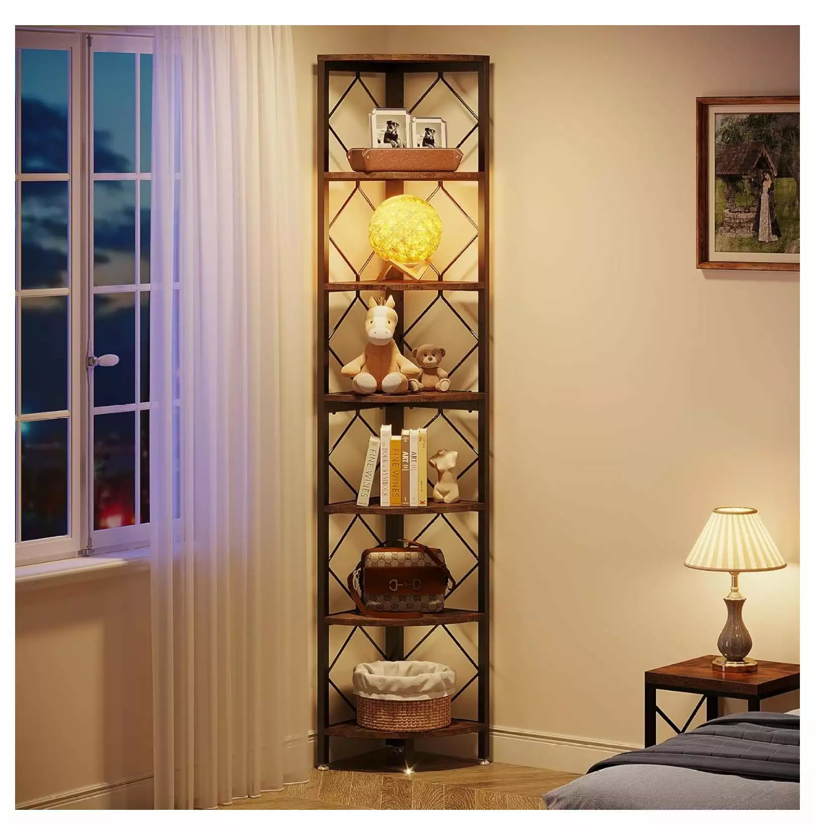 Our Killeryuki 7tier corner bookshelf emphasizes both Killeryuki and functionality Whether you need a place to store your favorite novels. display family photos. or showcase your plant collection. this versatile corner shelf can do it all. Previous page Perfect for Corners Fit seamlessly into tight corners. making it an ideal choice for those with limited space. Antidumpling Kit The extra antitipping device effectively ensures the safety and stability of the corner bookshelf. Spacesaving The narrow design will make the most of your vertical space without taking up too much floor area. Sector Bookshelf Board Its stylish sector design creates a visually appealing display or storing. Adjustable Feet Pads Adjustable feet pads will keep the tall corner shelf stable even on uneven floors or carpets. Next page 1 Perfect for Corners 2 Antidumpling Kit 3 Spacesaving 4 Sector Bookshelf Board 5 Adjustable Feet Pads Industrial Corner Bookshelf is a stylish and practical addition to any home Specifications Killeryuki Bookshelves
