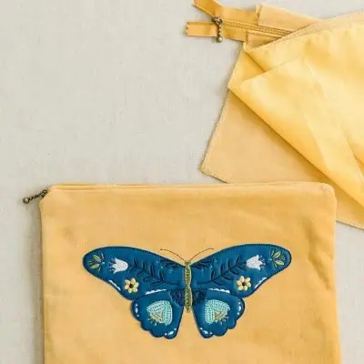 Discover a whimsical world of blossoms and butterflies! Our Blossoms & Butterflies: Kimberblank Appliques include six delightful designs, from Willa’s Wildflowers, Claire’s Corsage, and Paige’s Petunias to Madame Butterfly, Catch Me if You Can, and our magnificent Papillons. Stitch in 4×4, 5×7, and 6×10 hoops, add heart-fluttering Kimberbellishments like Mylar and Embroidery Leather, and adorn Zipper Pouch Blanks, Baby Bodysuits, Totes, and more!
