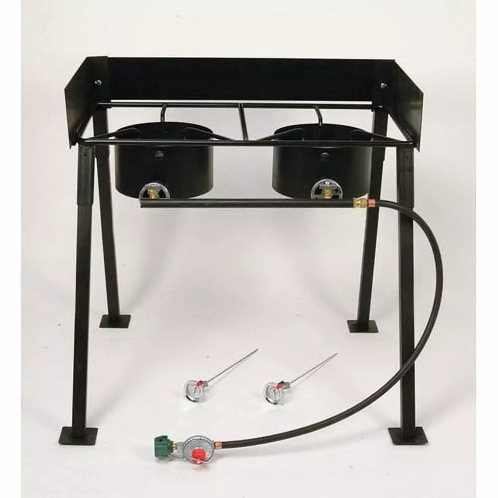 | Features | Listed LP hose and regulator with type-1 connection; removable windshield. 14-by-14-inch cooking surface; 54.000-BTU cast burner; CSA design certified. Portable propane single-burner outdoor camp stove made of durable iron. Measures approximately 17 by 17 by 28-7/8 inches; 1-year limited warranty. Attachable interlocking legs for stability; deep-fry thermometer and recipes included |