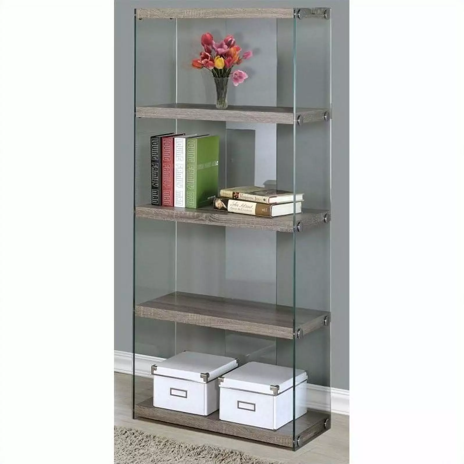 Add a modern touch to your home with this dark taupe reclaimed-look. bookcase featuring tempered glass sides and stylish. polished chrome accents. 5 open shelves provide a fashionable way to display your most treasured possessions.