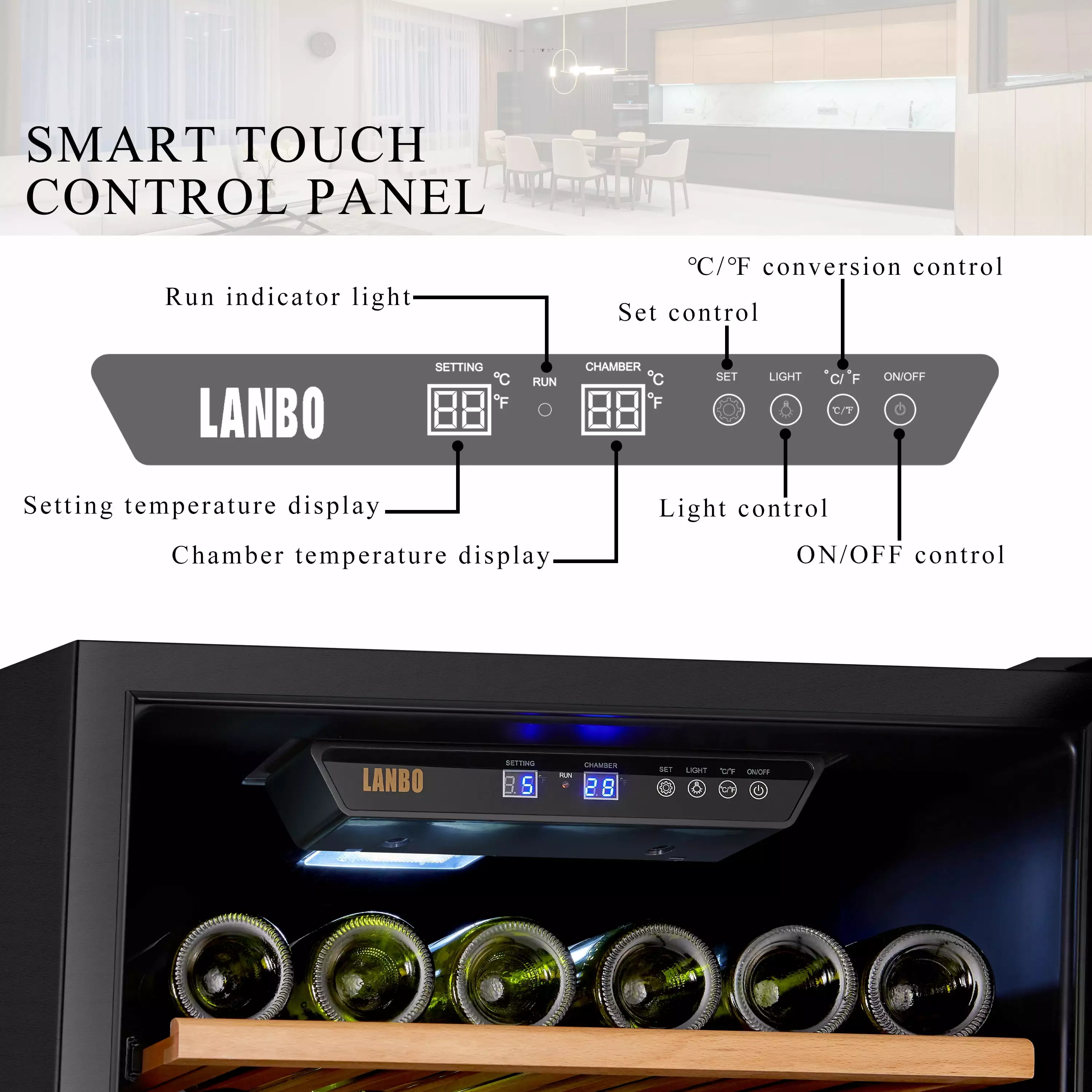 The Lanbo LW177S single zone wine fridge slides between cabinets to create a custom. 216.10 lbs. built-in wine cellar in your kitchen. It can also stand alone in any room of the house. Lanbo wine refrigerator keeps an impressive 171 bottle standard bottles at their ideal temperature with precision digital controls that let you set the temperature anywhere with smart touch control panel. LW177S wine fridge is a real beauty. thanks to its triple paned UV-protected glass. stainless steel trimmed and beech wood finishes. A digital LED temperature display makes temperatures easy-to-read and ensures wine is being stored and served at the appropriate temperature. Adjustable temperature range allows users to select a proper. customized storage and serving temperature for light or dark wines.