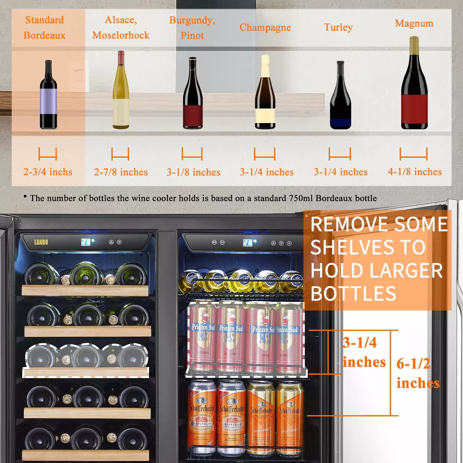 - Store your wine and drinks in the perfect environment with the sleek LANBO 33 Bottle and 70 Can wine fridge and beverage cooler. If you prefer to store Burgundy. Pinot Noir or Champagne. please kindly remove 1-2 shelves. but note that the number of loading bottles will be reduced accordingly.