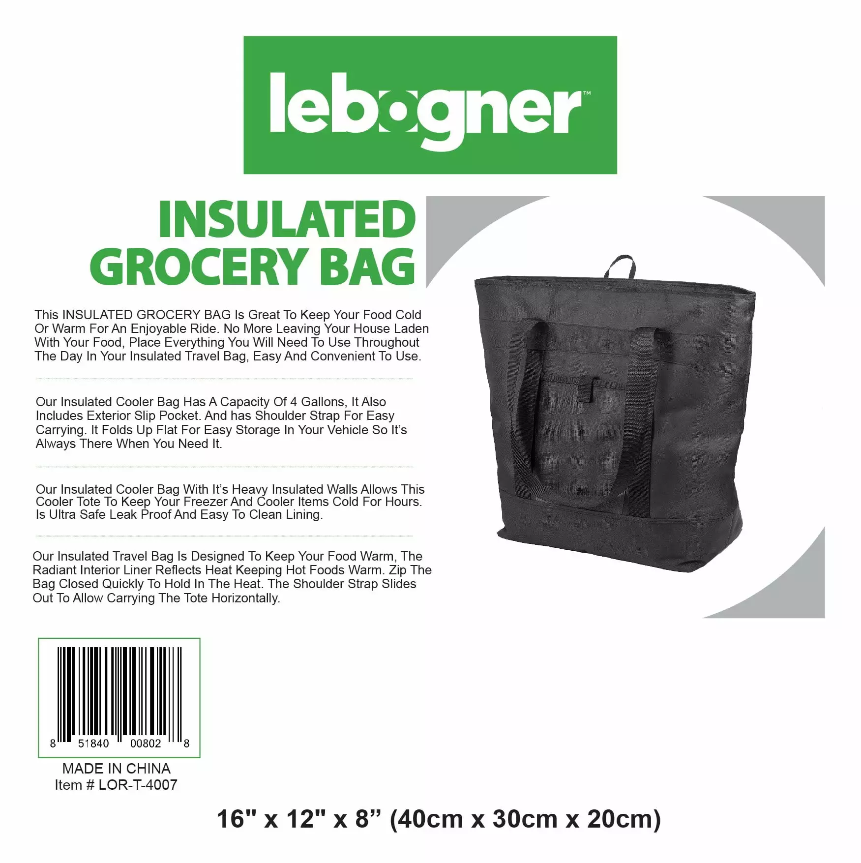 The Lebogner 600D PREMIUM QUALITY FABRIC Insulated cooler bag is ideal to use while you shop for groceries or to travel on vacation and use it for picnics while camping.